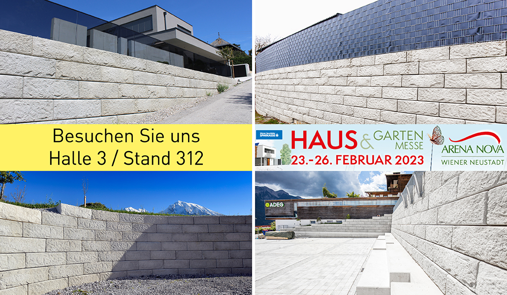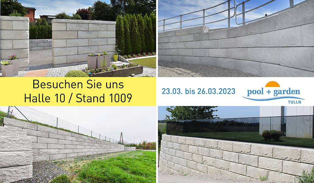 Vom 23.03. bis 26.03.2023 sind wir auf der pool + garden in Tulln und informieren Sie gerne über die Einsatzmöglichkeiten unseres SW-Stützwandsystems.