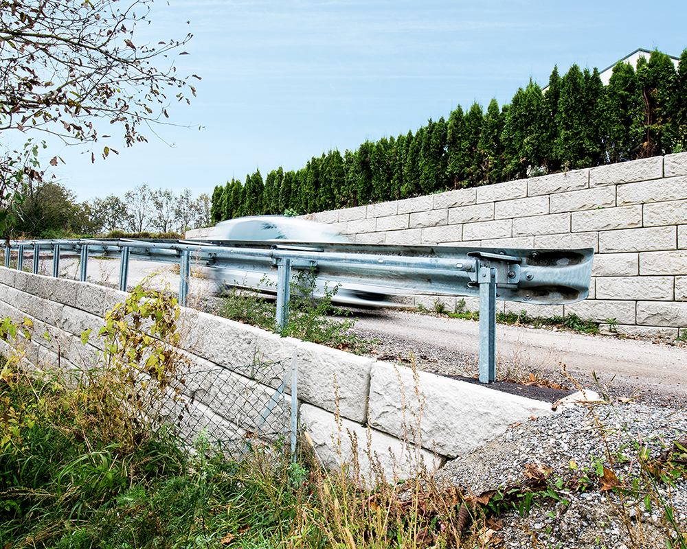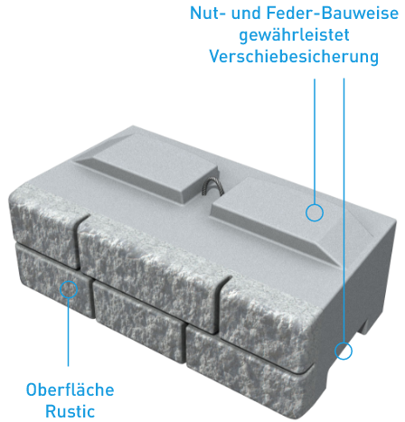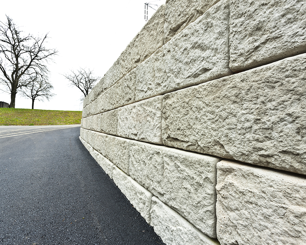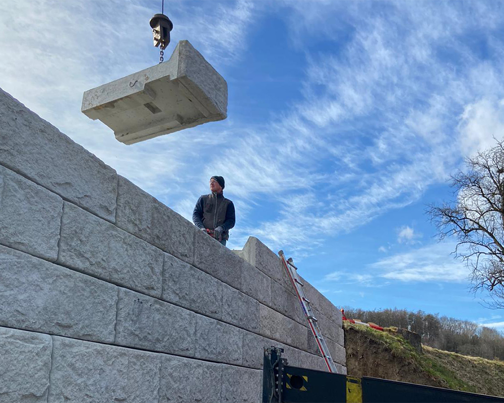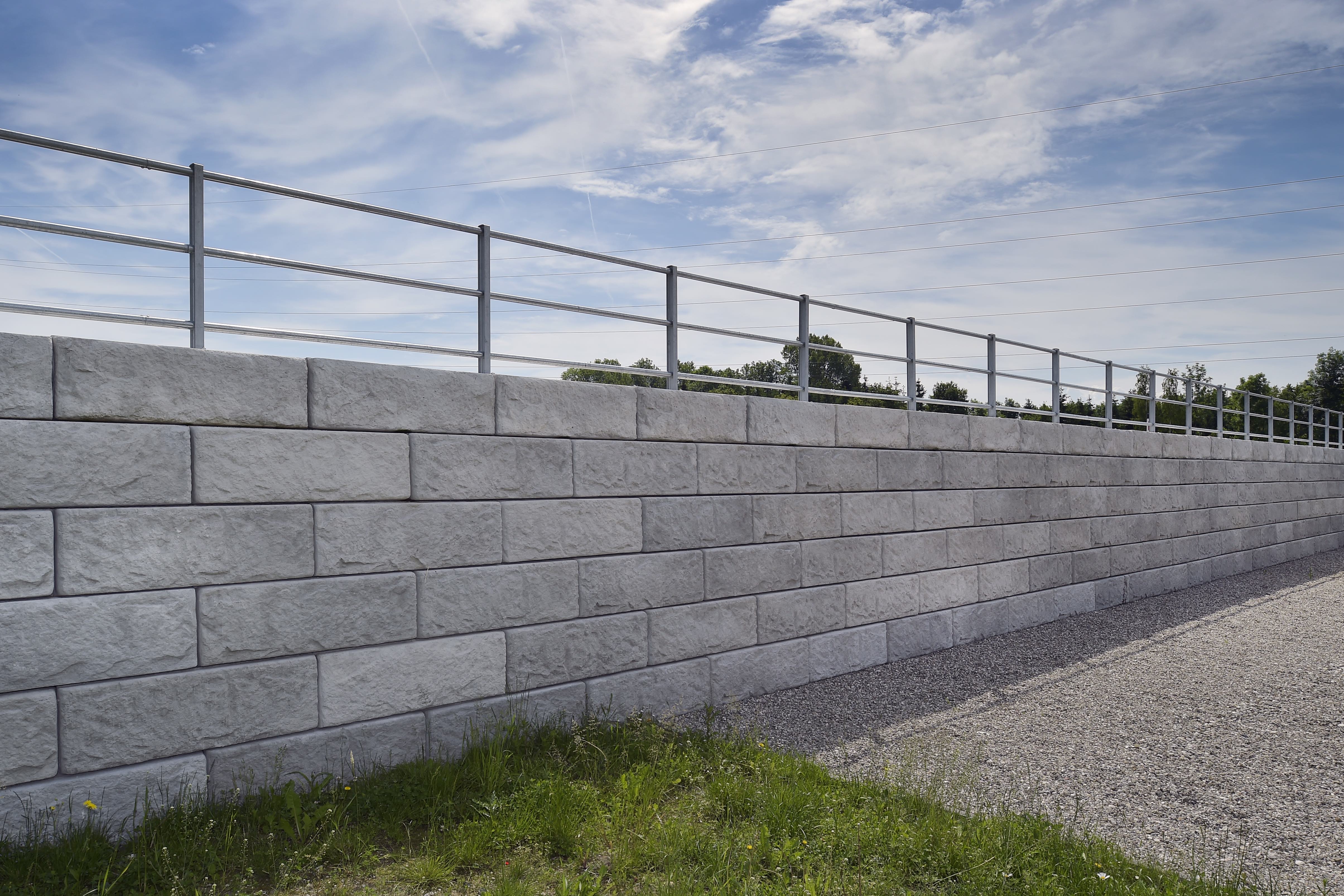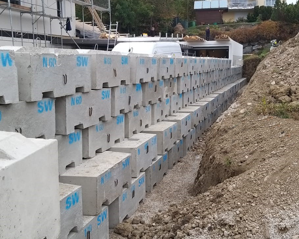 Das SW-Stützwandsystem kann sowohl als klassische Beton-Schwergewichtsmauer mit unterschiedlich tiefen Systemsteinen oder in Kombination mit Geogittern als erdbewehrte Schwergewichtsmauer ausgeführt werden. Unabhängig welche Bauweise Sie wählen – die große Versetzleistung macht das dauerhafte SW-Stützwandsystem ideal für den Infrastrukturbau.