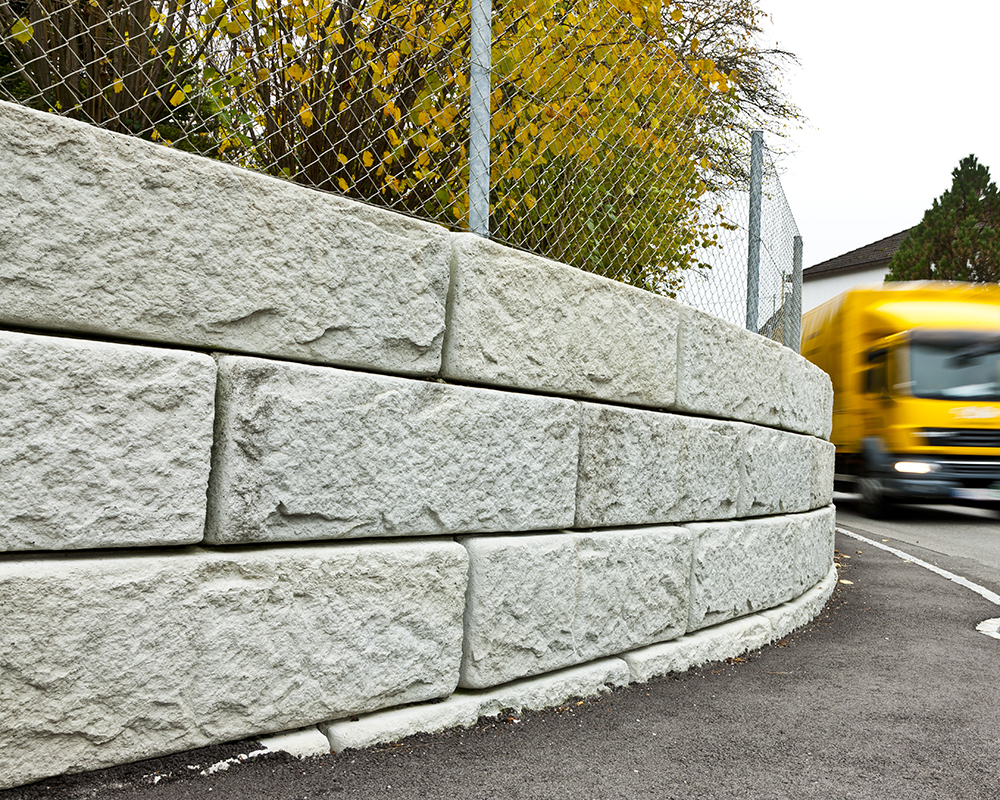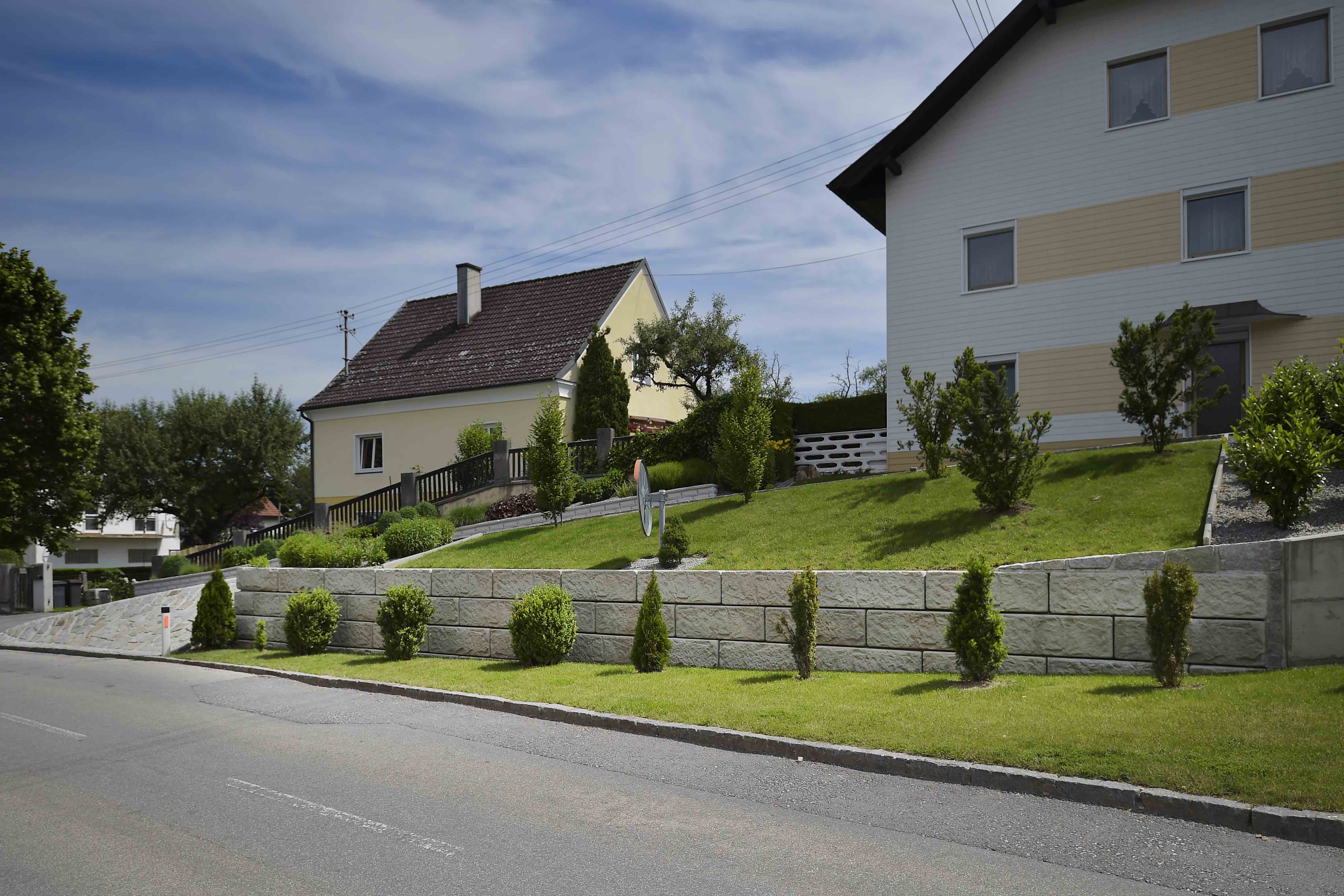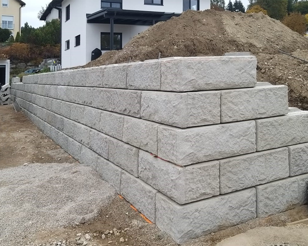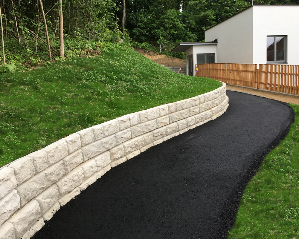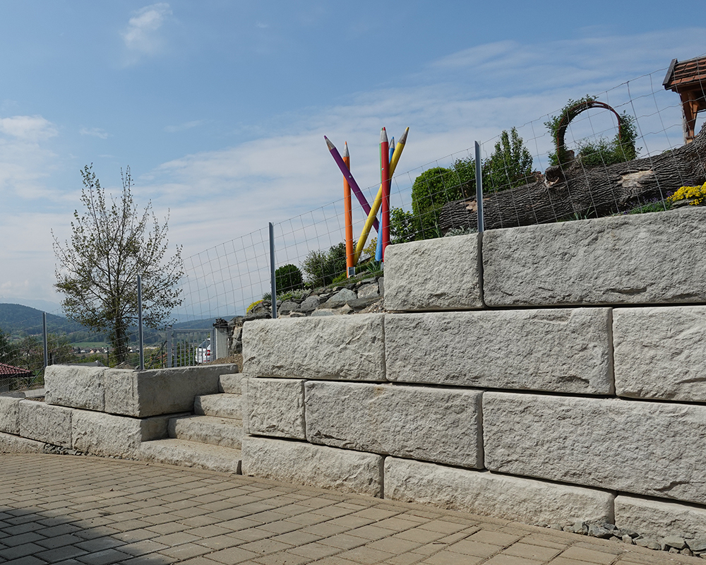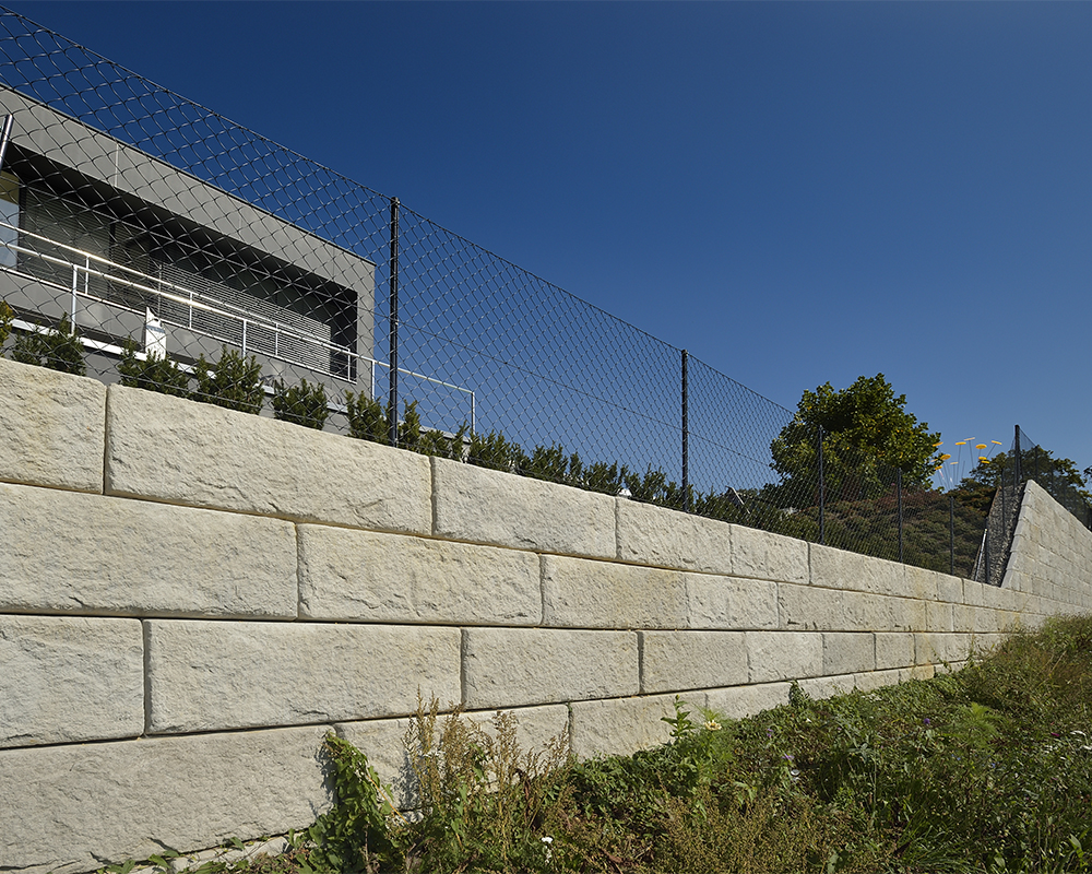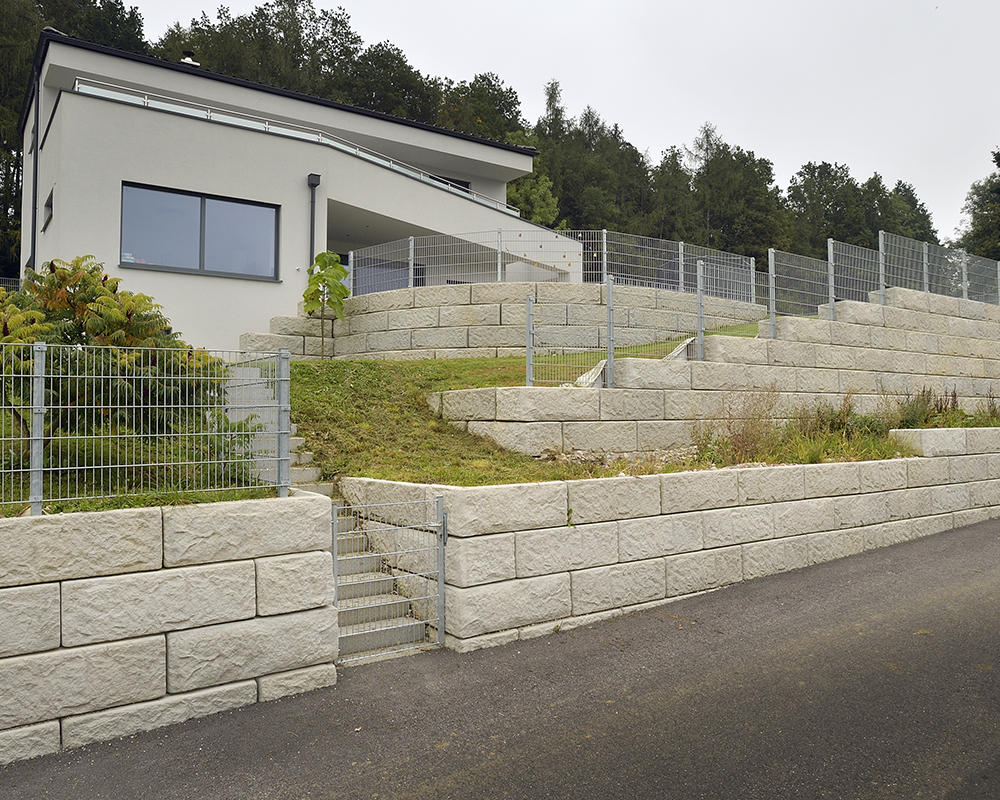 Optisch eine massive Granitblockmauer, technisch ein raffiniertes Stützwandsystem aus Beton - ideal zur Hangsicherung.