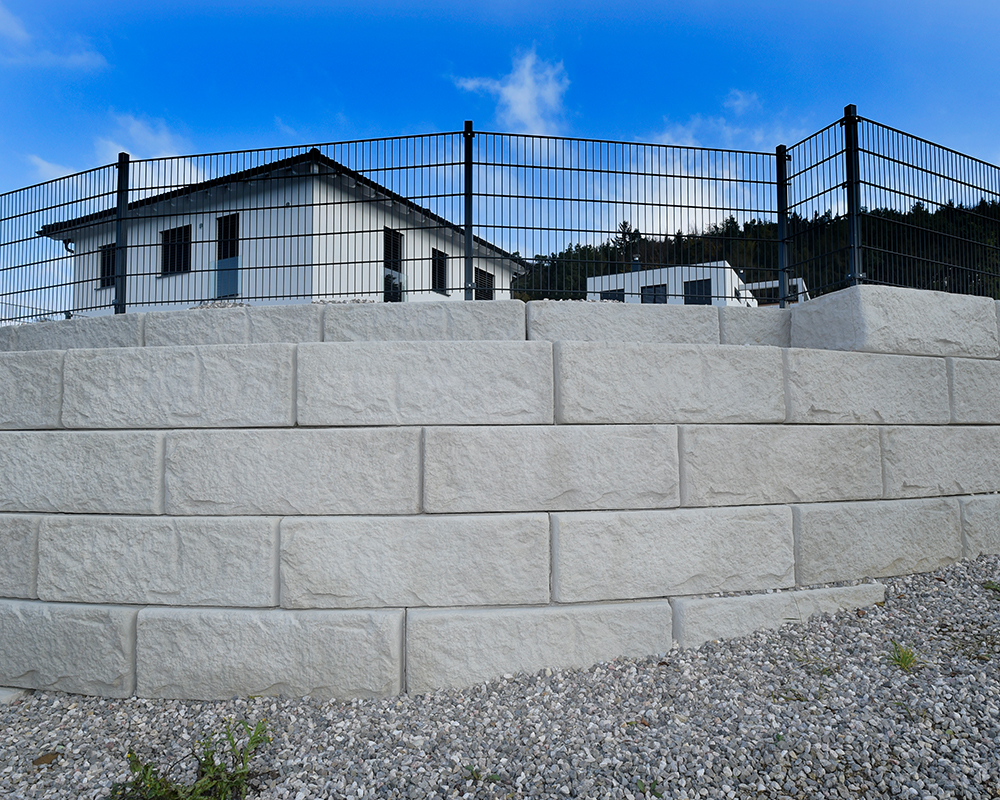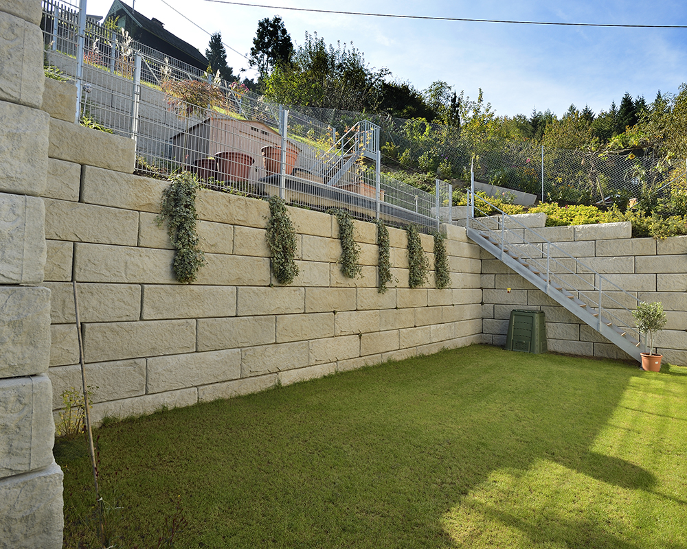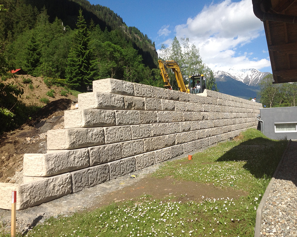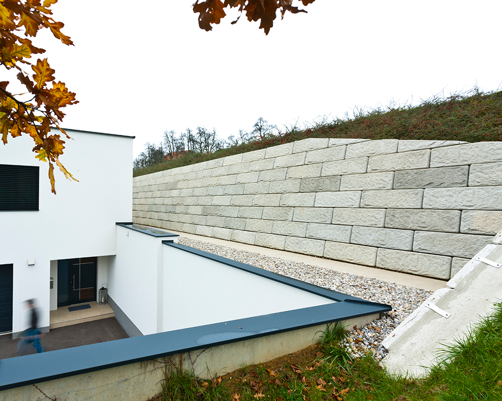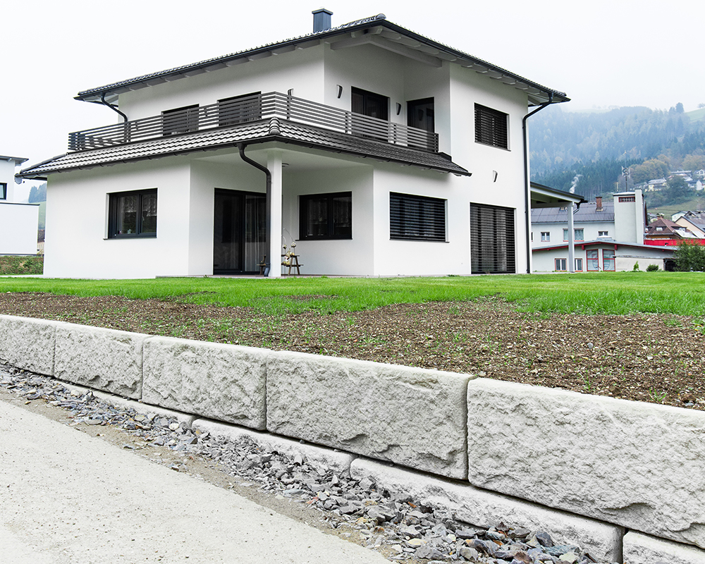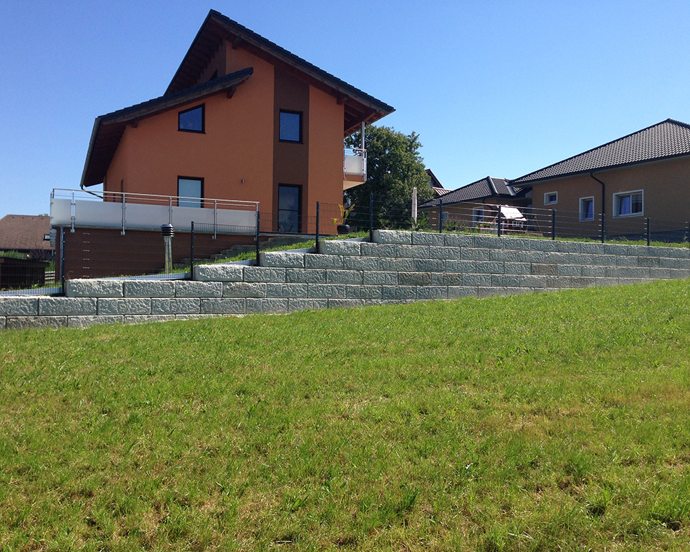 Optisch eine massive Granitblockmauer, technisch ein raffiniertes Stützwandsystem aus Beton - ideal zur Hangsicherung.