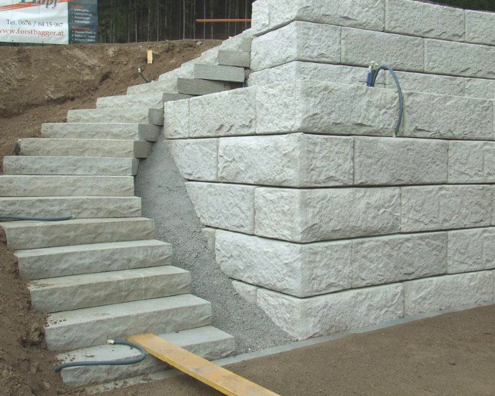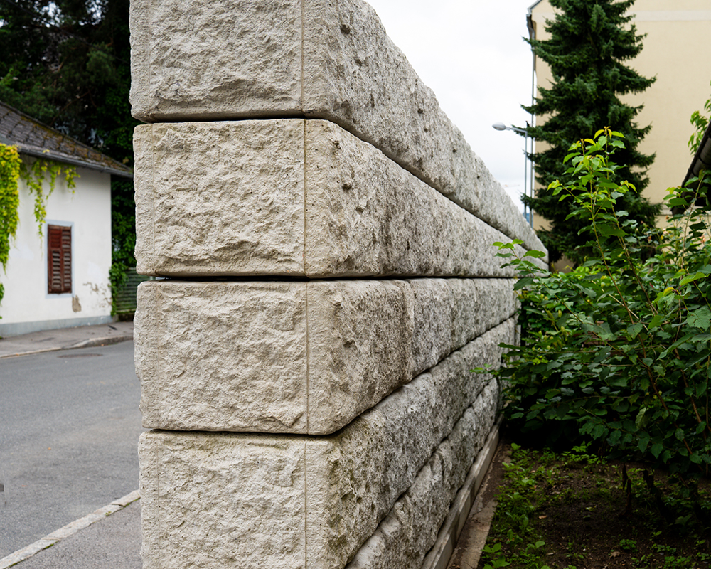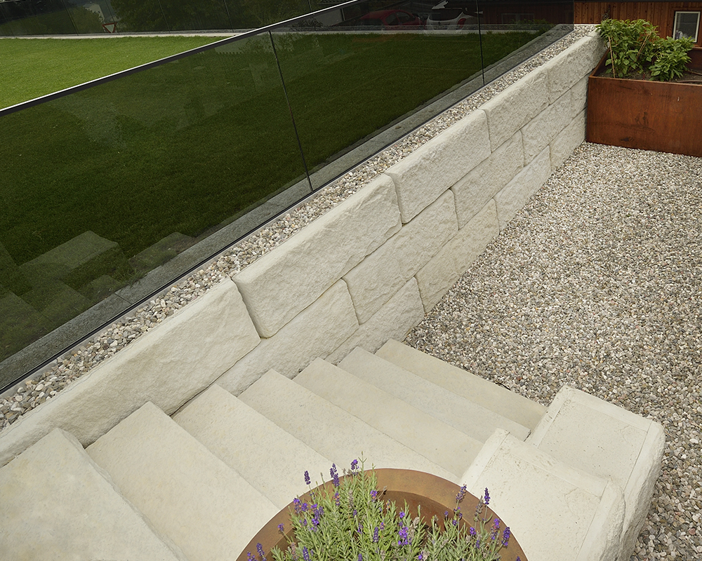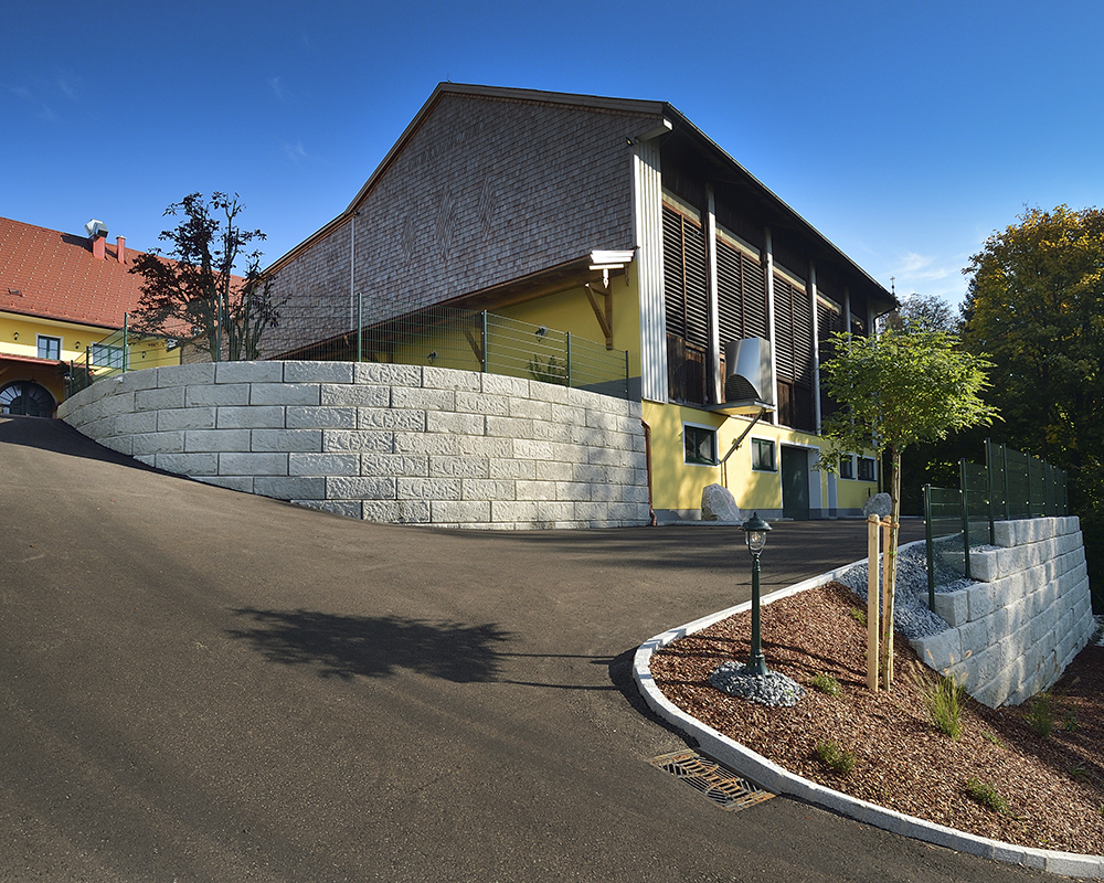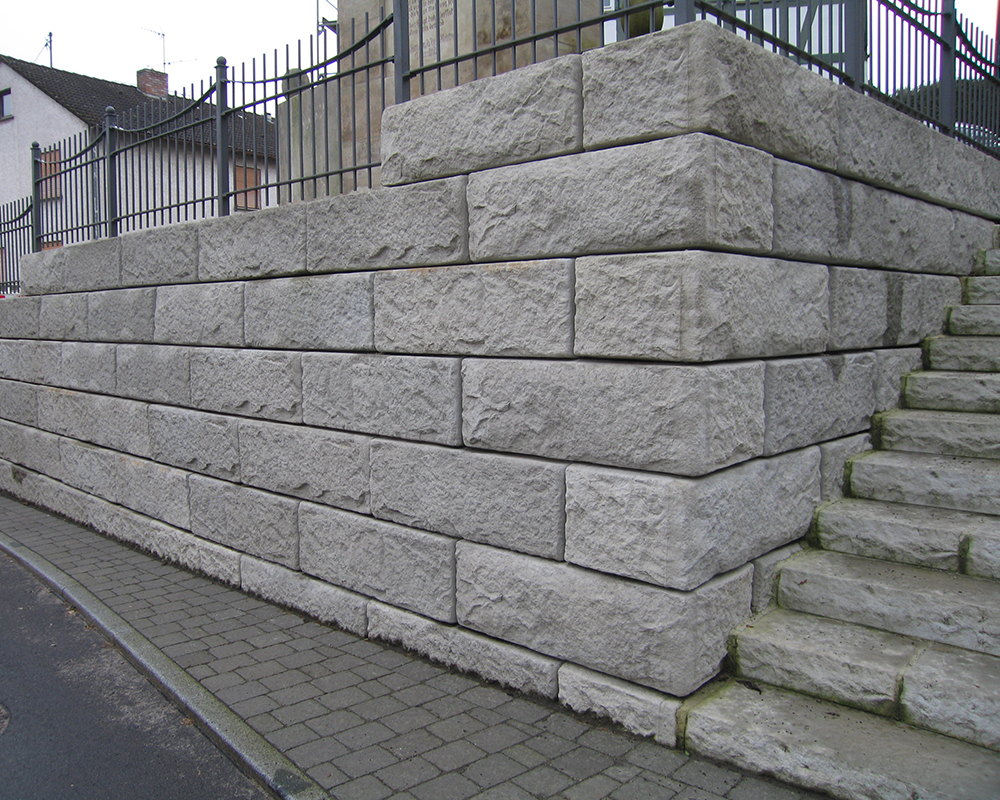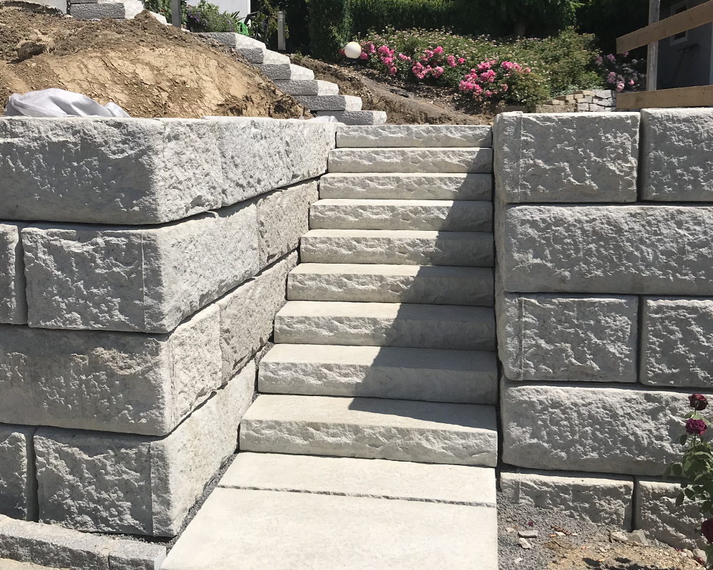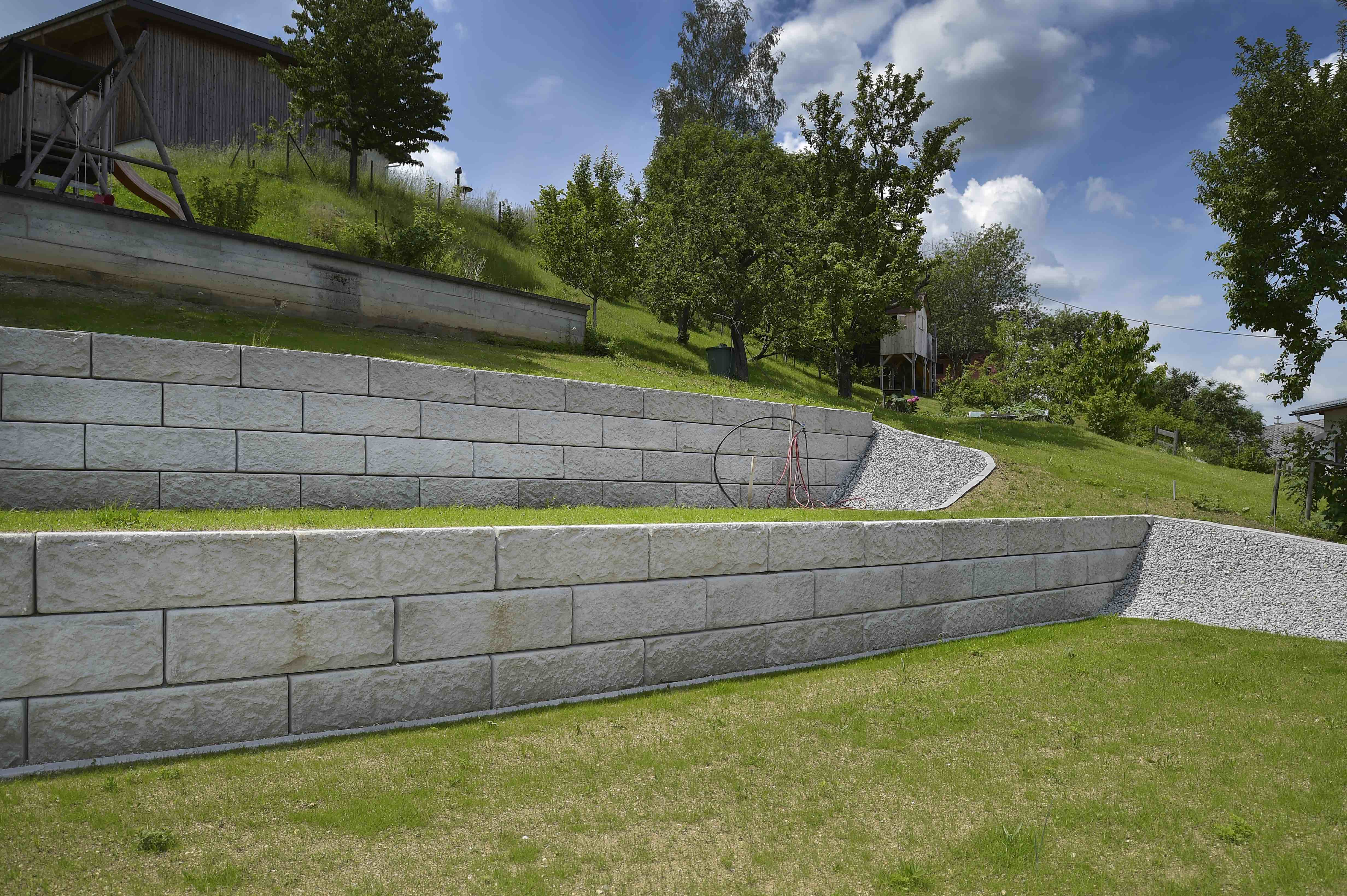 Optisch eine massive Granitblockmauer, technisch ein raffiniertes Stützwandsystem aus Beton - ideal zur Hangsicherung.