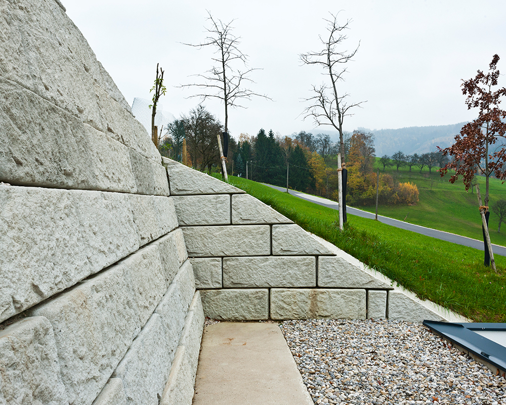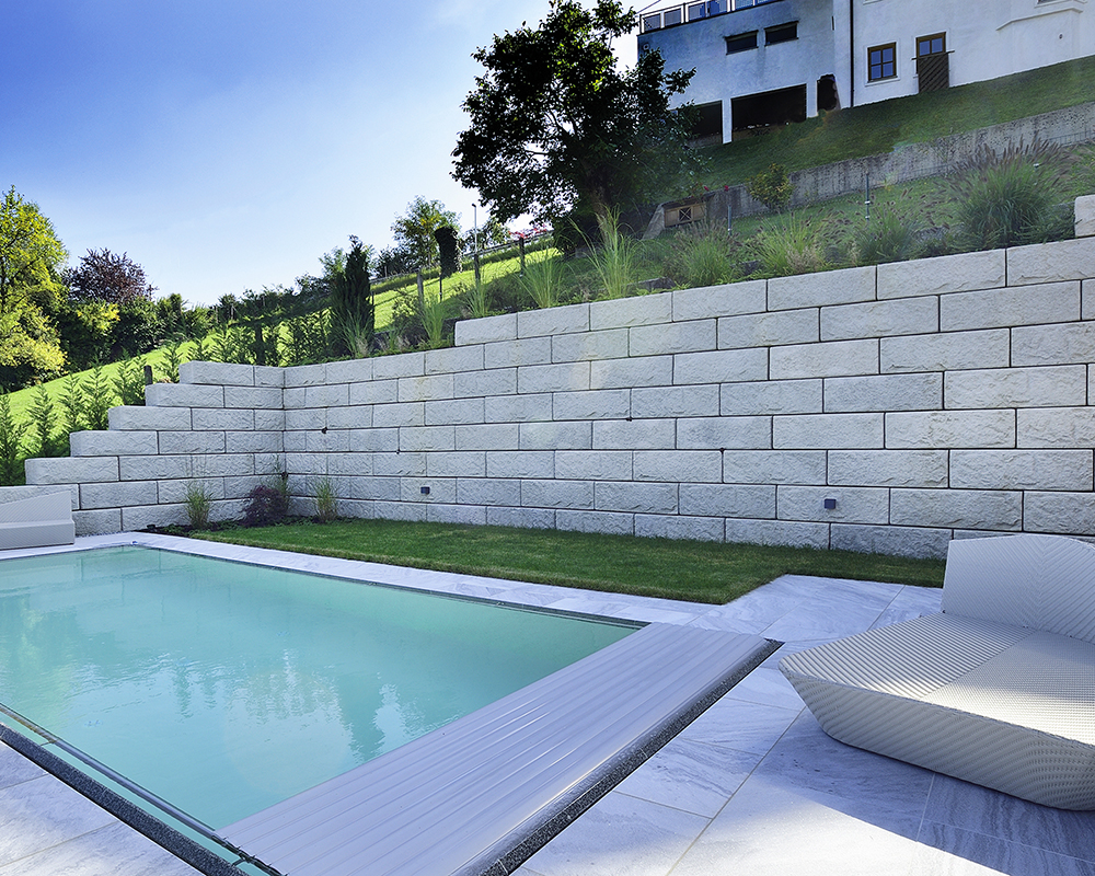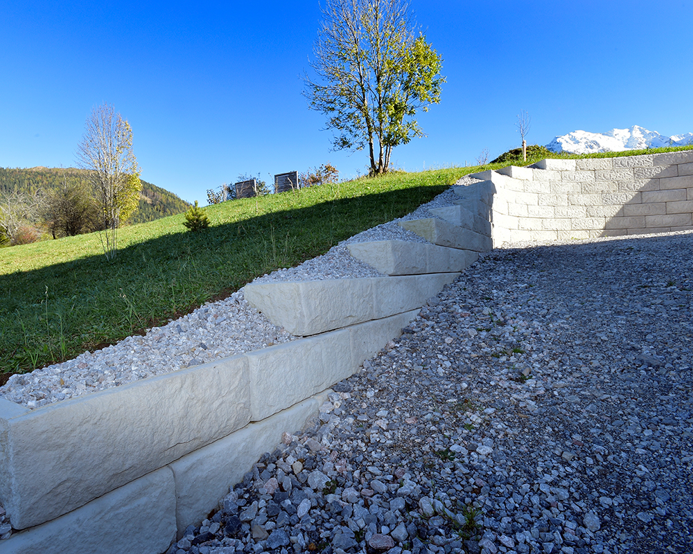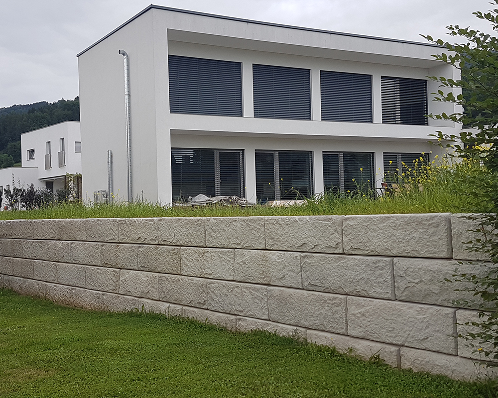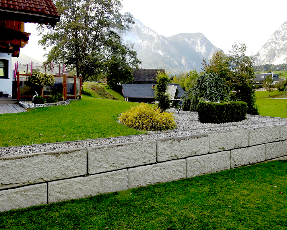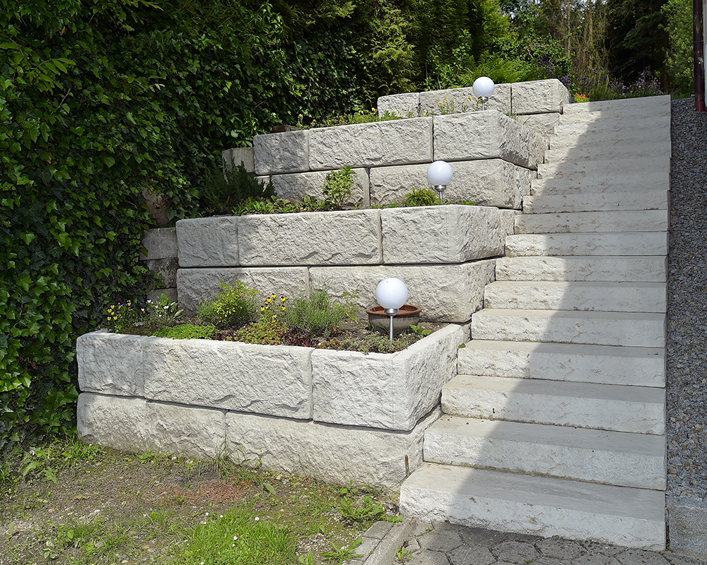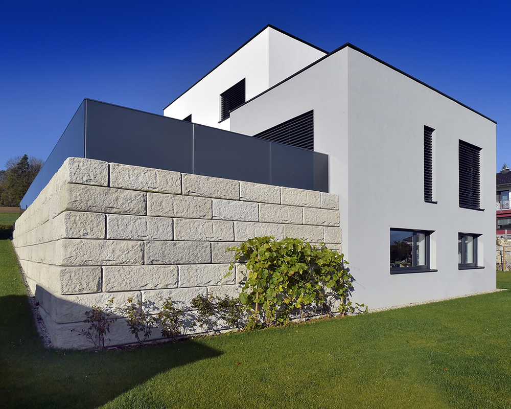 Optisch eine massive Granitblockmauer, technisch ein raffiniertes Stützwandsystem aus Beton - ideal zur Hangsicherung.