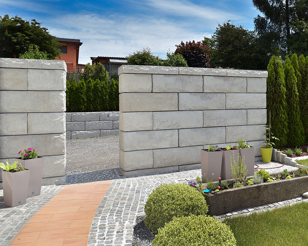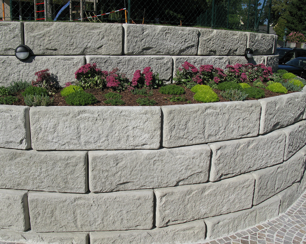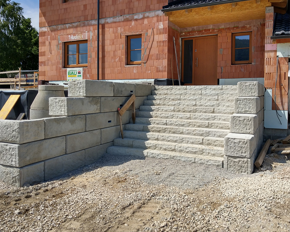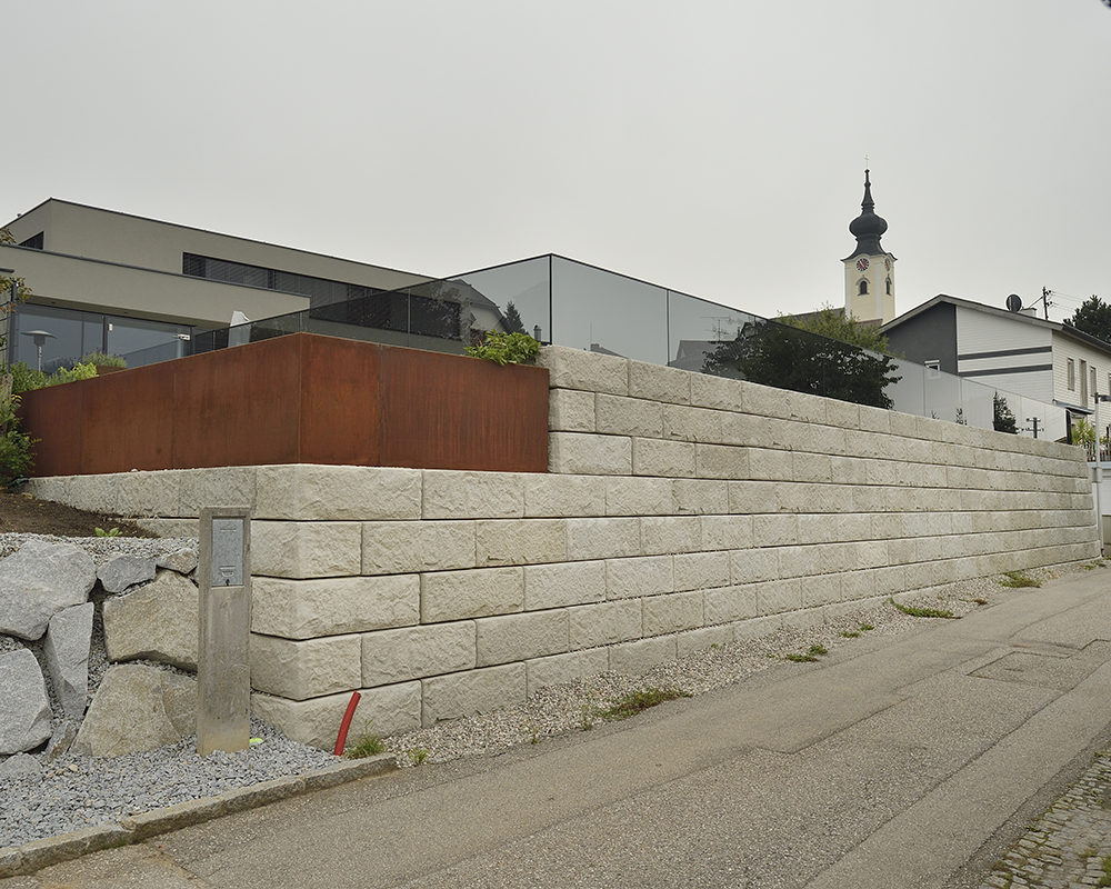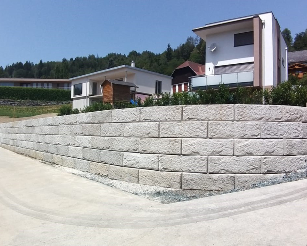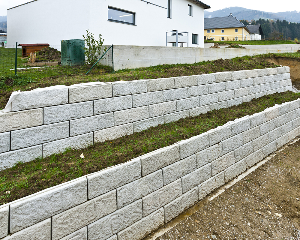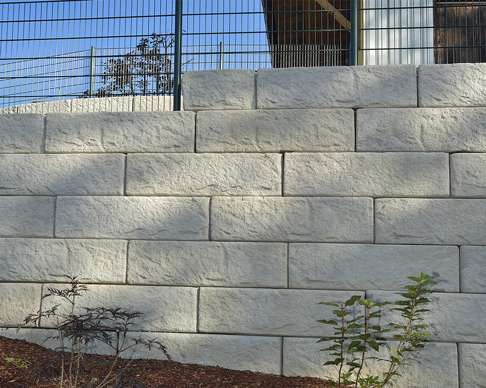 Optisch eine massive Granitblockmauer, technisch ein raffiniertes Stützwandsystem aus Beton - ideal zur Hangsicherung.