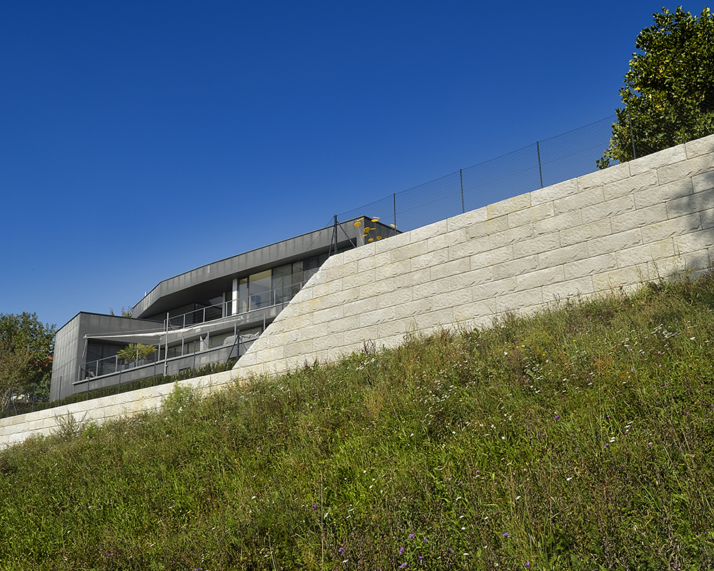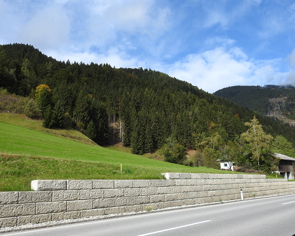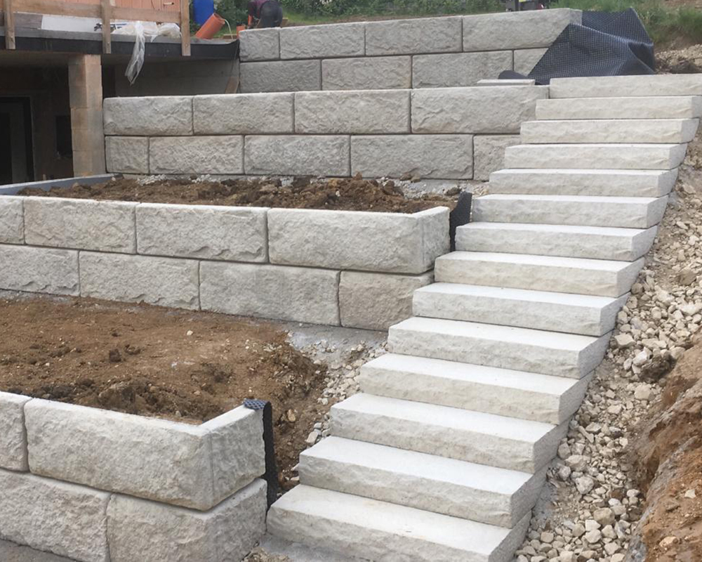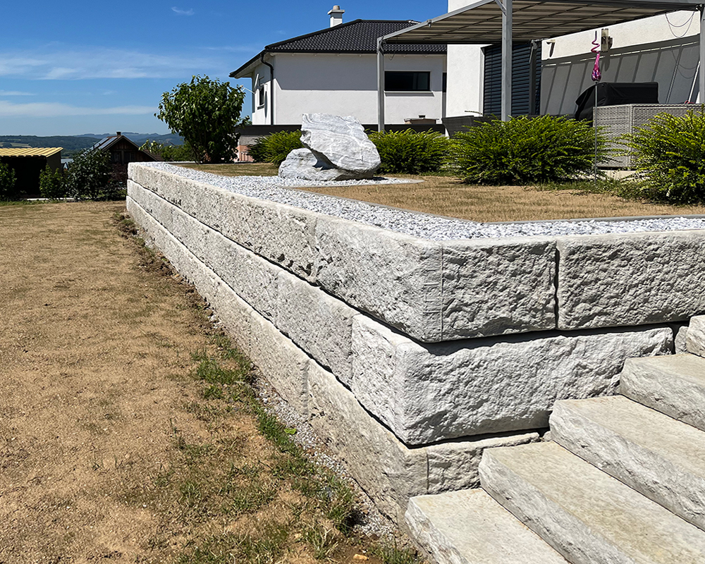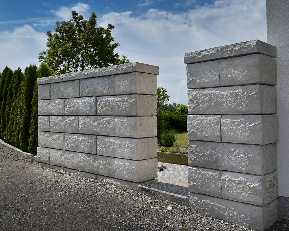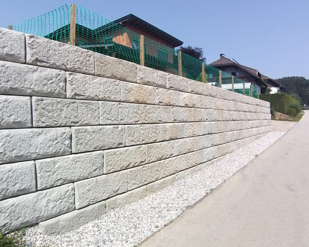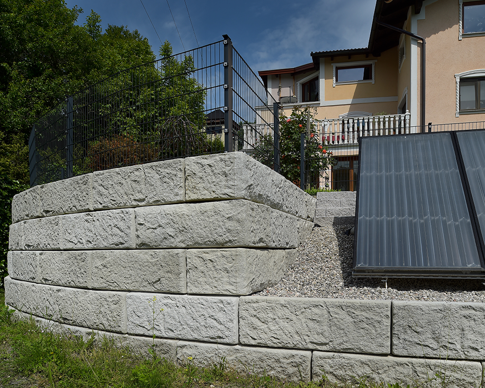 Optisch eine massive Granitblockmauer, technisch ein raffiniertes Stützwandsystem aus Beton - ideal zur Hangsicherung.