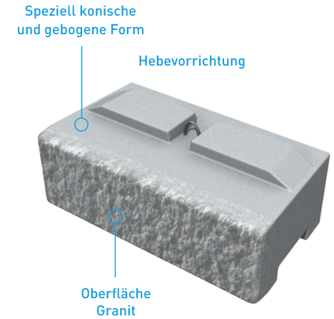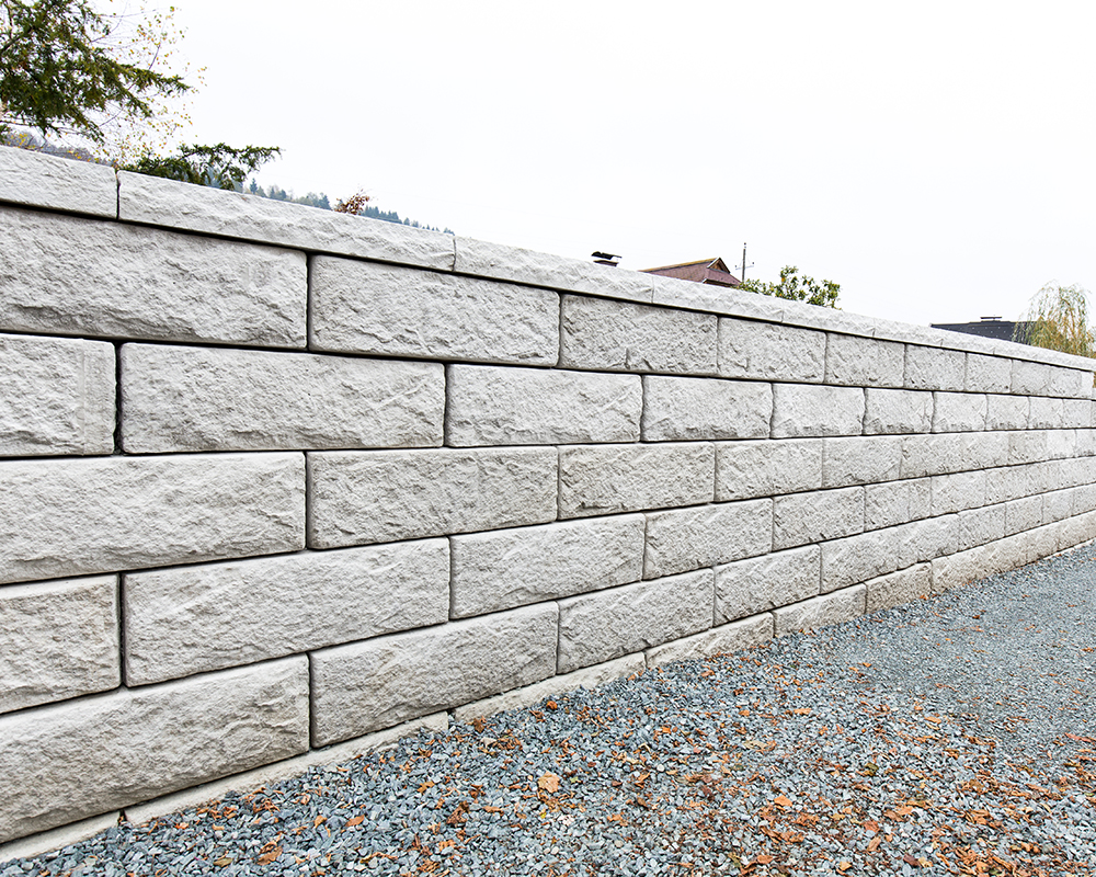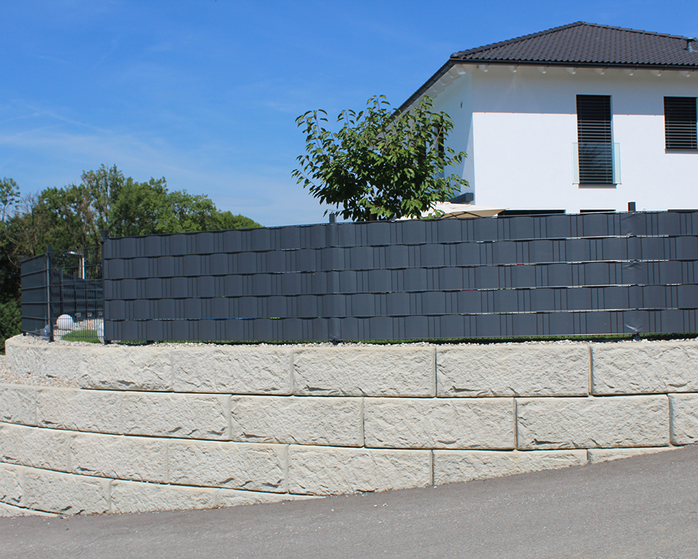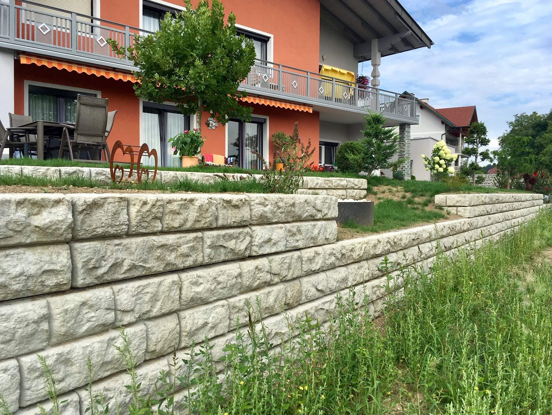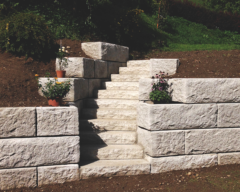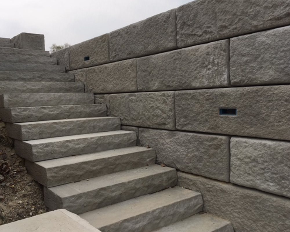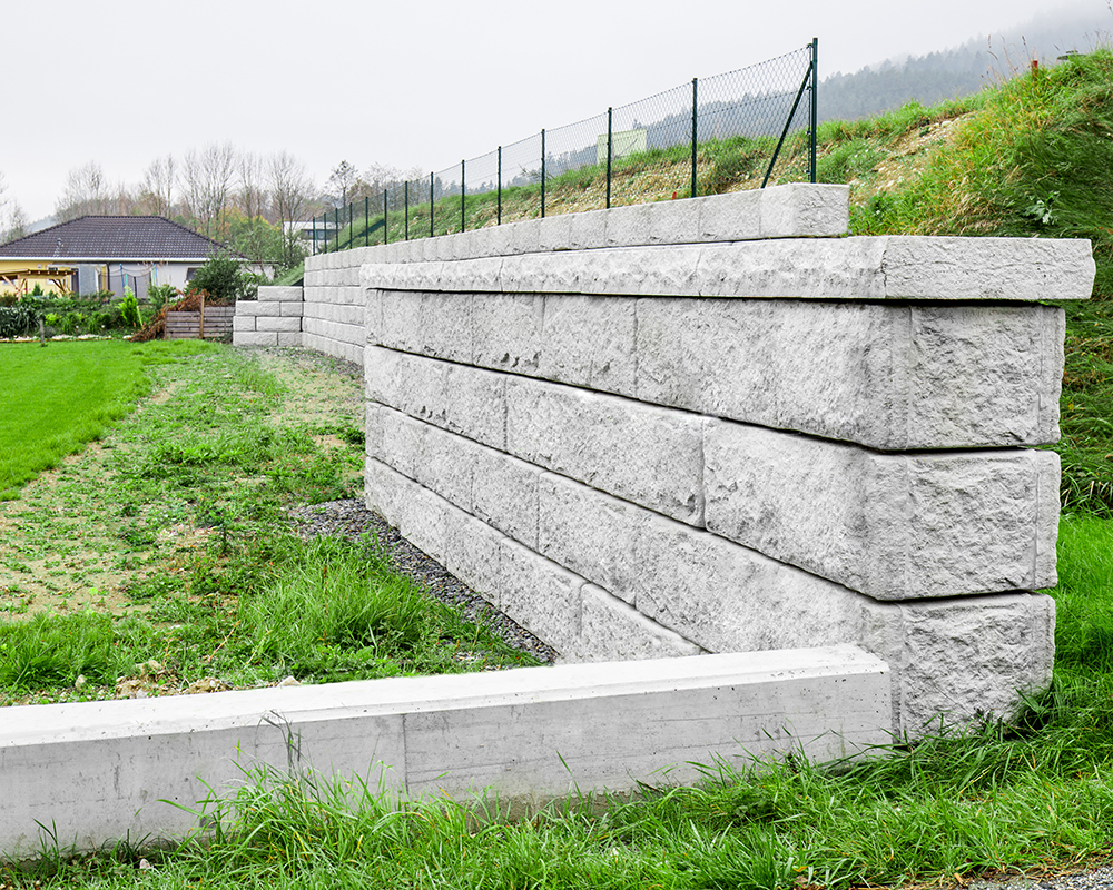Optisch eine massive Granitblockmauer, technisch ein raffiniertes Stützwandsystem aus Beton - ideal zur Hangsicherung.