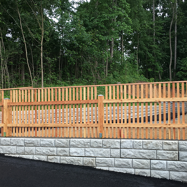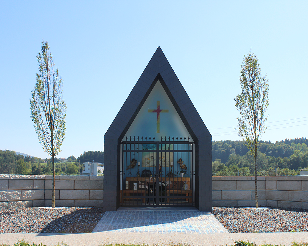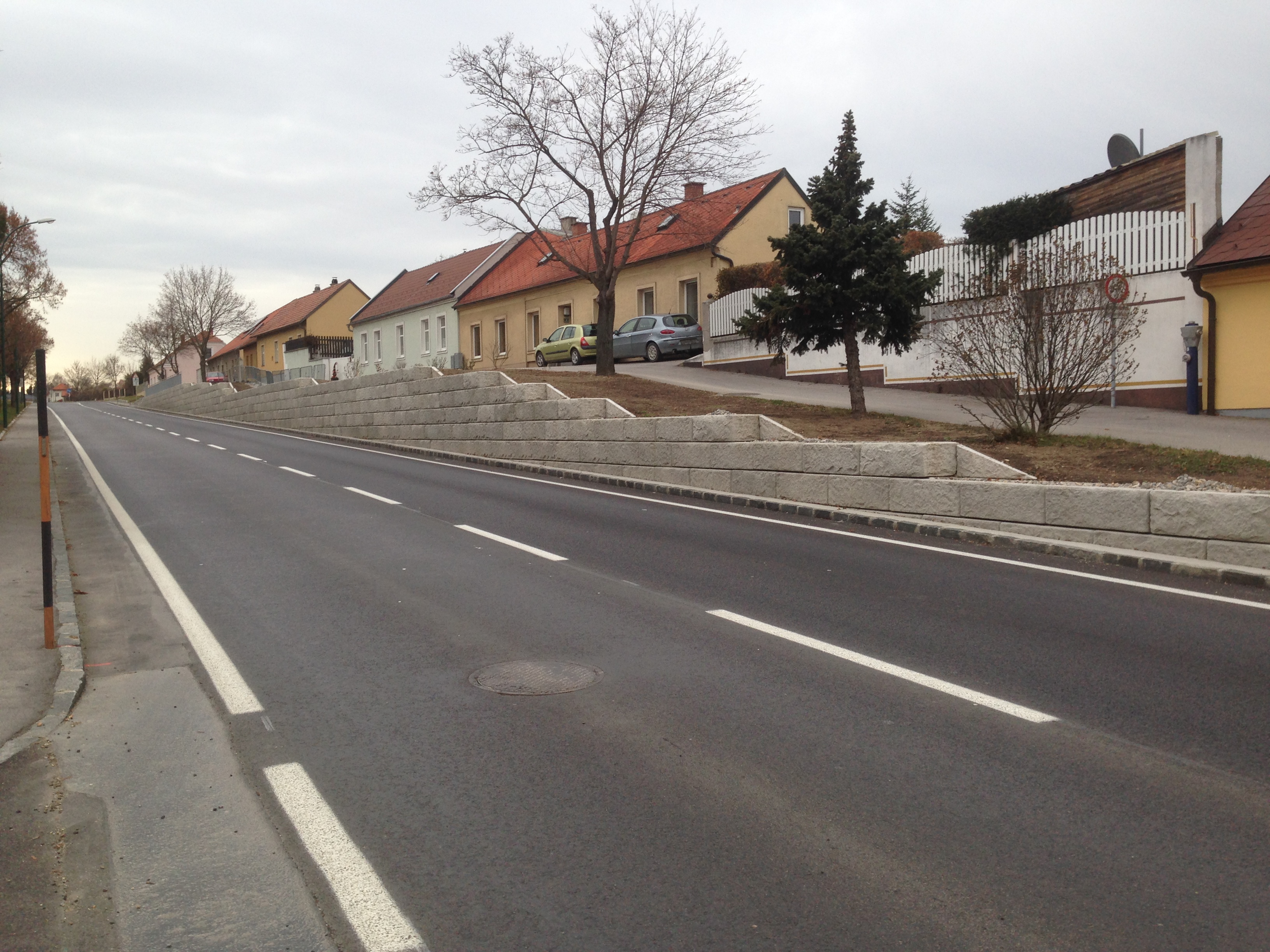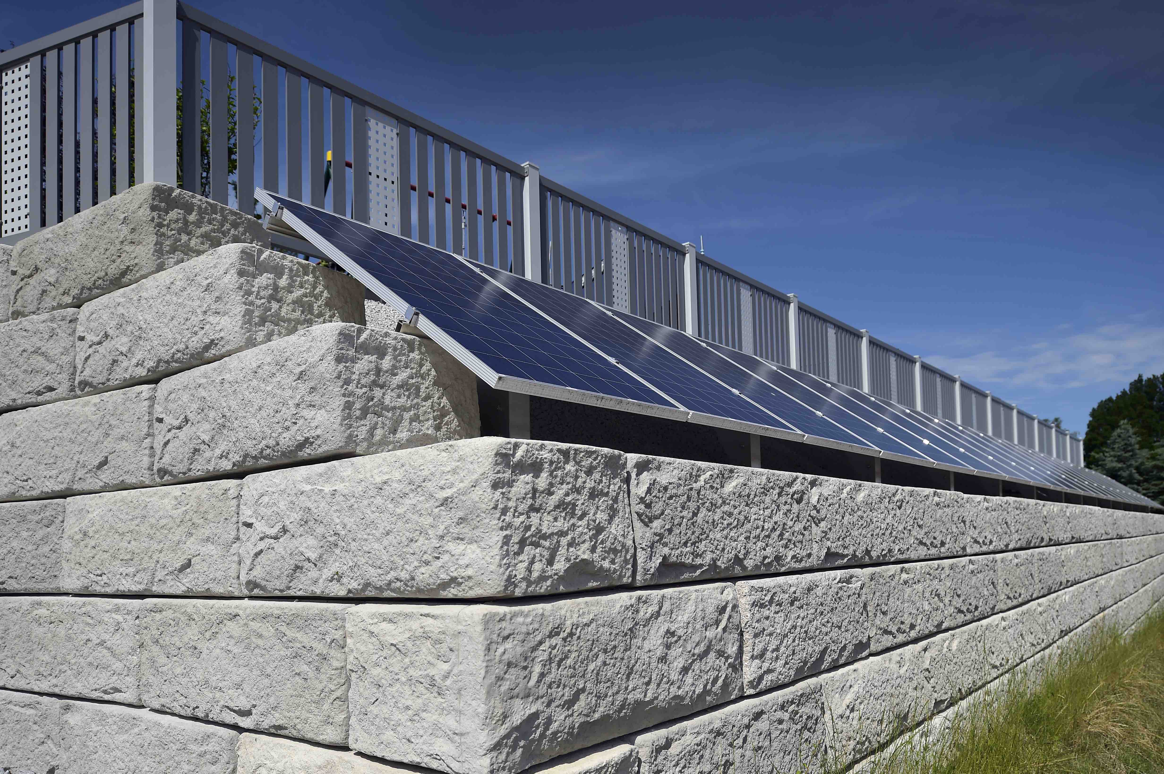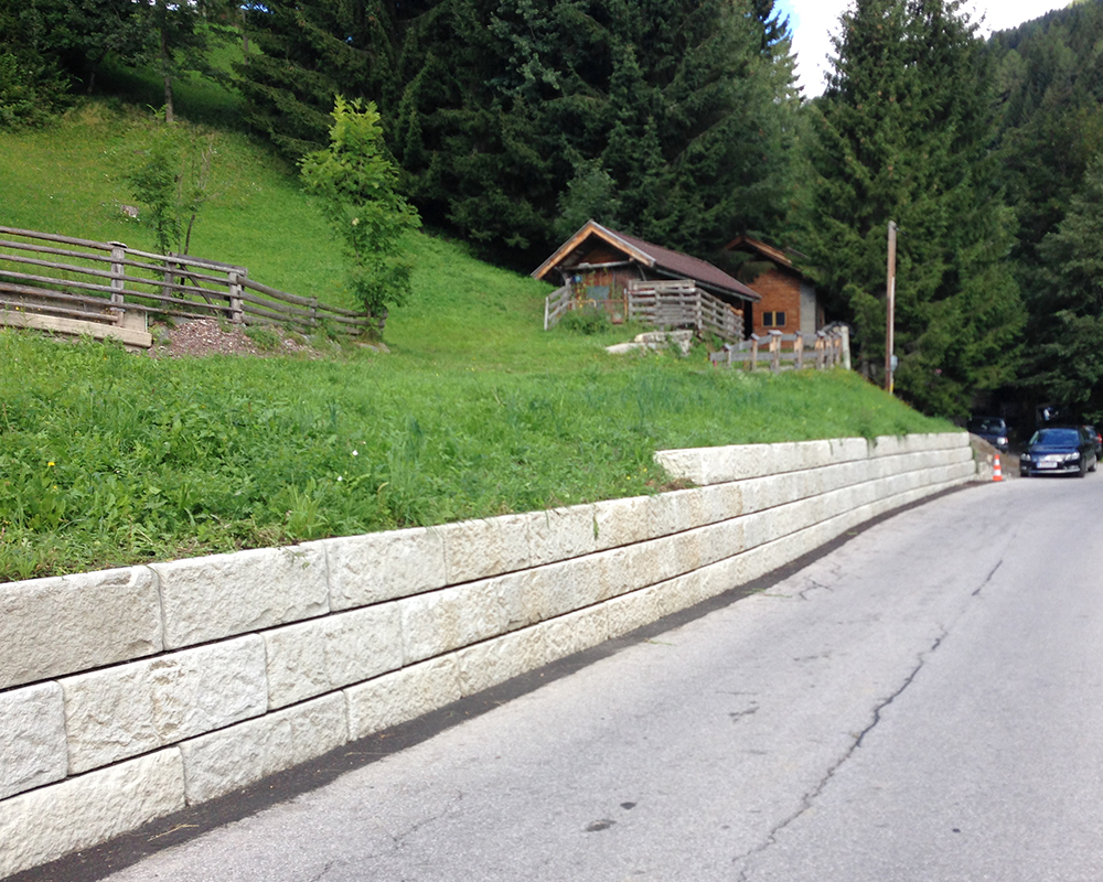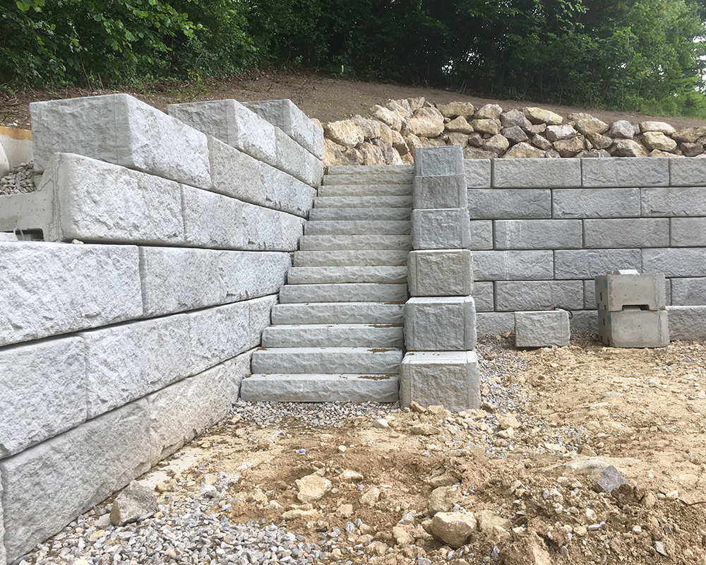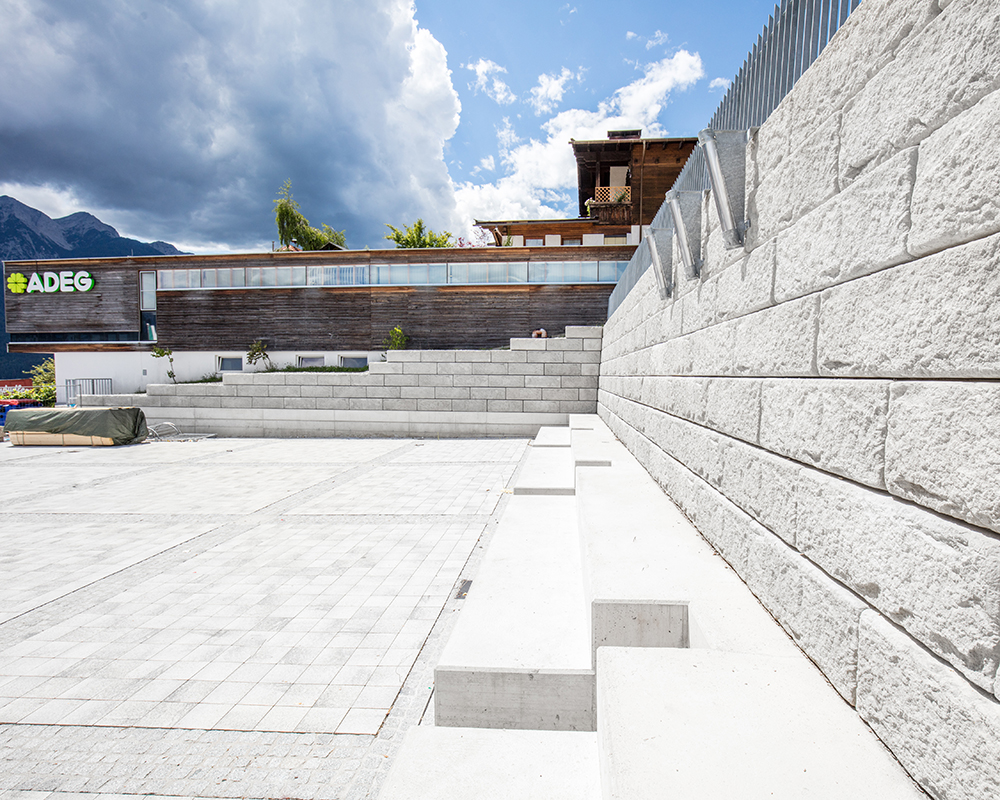 Optisch eine massive Granitblockmauer, technisch ein raffiniertes Stützwandsystem aus Beton - ideal zur Hangsicherung.