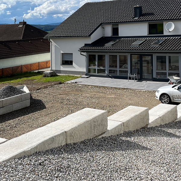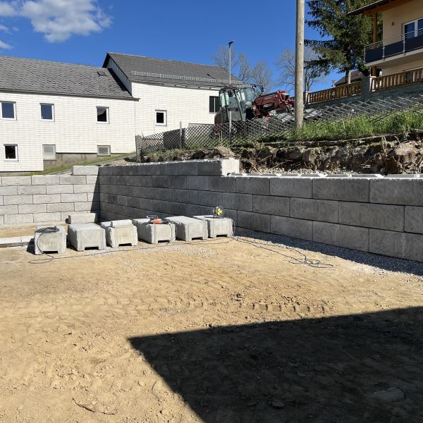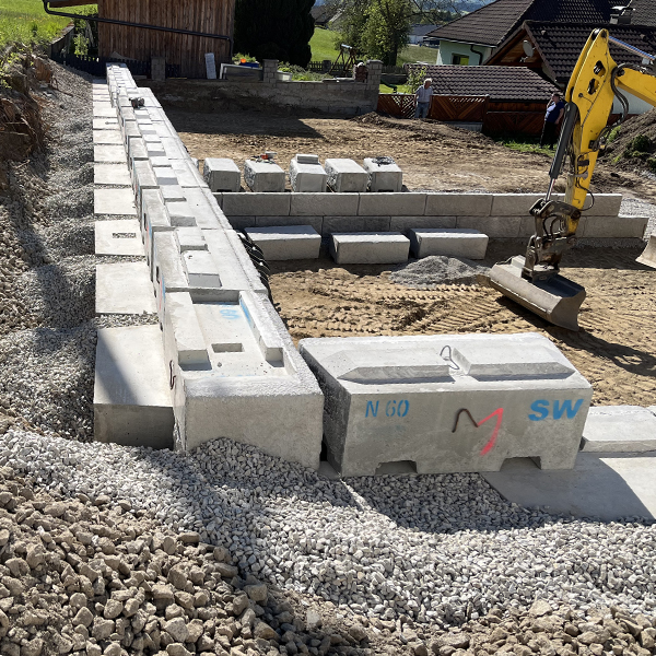 Errichtung einer SW-Stützwand bei einem Wohnhaus in Vorderweißenbach in Oberösterreich zur Gestaltung einer Parkfläche sowie einer danebenliegenden Grünfläche.