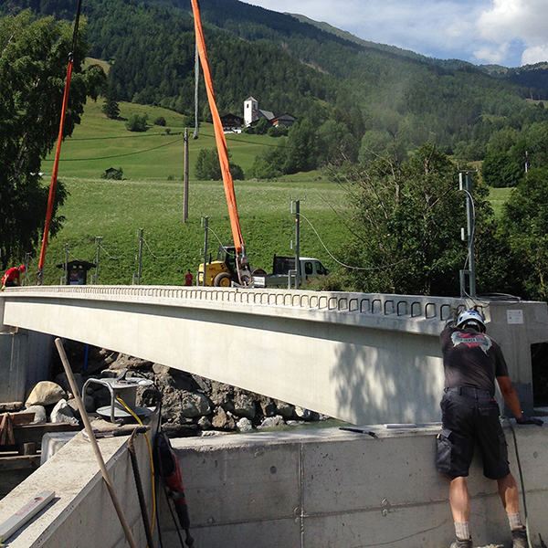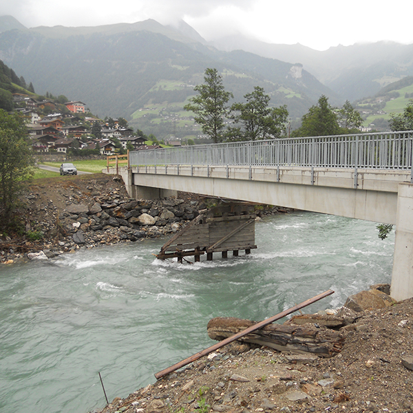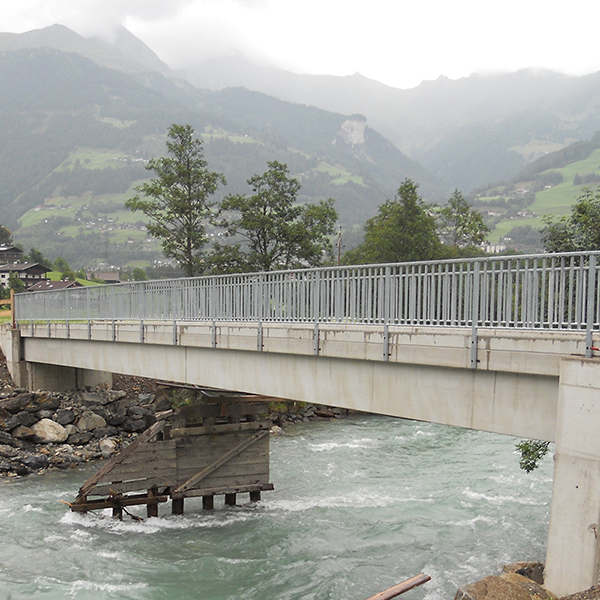 Die Brücke befindet sich in der Gemeinde Matrei in Osttirol. Das desolate Stahl-Holztragwerk wurde durch eine dauerhafte und wartungsarme Stahlbeton-Fertigteilbrücke ersetzt. Das Geländer konnte an den von uns vorgesehenen Gewindeankern, ohne aufwendige Bohrarbeiten, direkt auf die beiden Außenträger montiert werden. Die Tragwerksabmessungen betragen 25,0 m x 3,44 m. Die Brücke ist für Fahrzeuge bis 44 Tonnen befahrbar.