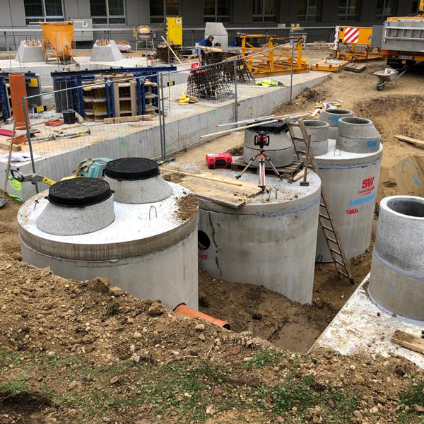 Das Projekt sieht die Entwässerung eines neu errichteten Hubschrauberlandeplatzes beim Krankenhaus UKH Wien Meidling vor. Die anfallenden Oberflächenwässer des Hubschrauberlandeplatzes mit ca. 600 m² Fläche werden über einen Entspannungsschacht, Schieberschacht mit elektrisch gesteuerten Absperrklappen, Kompaktschlammfang, Mineralölabscheider sowie nachfolgenden Sickerschächten entwässert. Beim Austreten von Leichtflüssigkeit in größeren Mengen werden mittels Leichtflüssigkeit-Sensor die Absperrklappen umgeschaltet und das anfallende Wasser samt Leichtflüssigkeit in ein Rückhaltebecken geleitet.