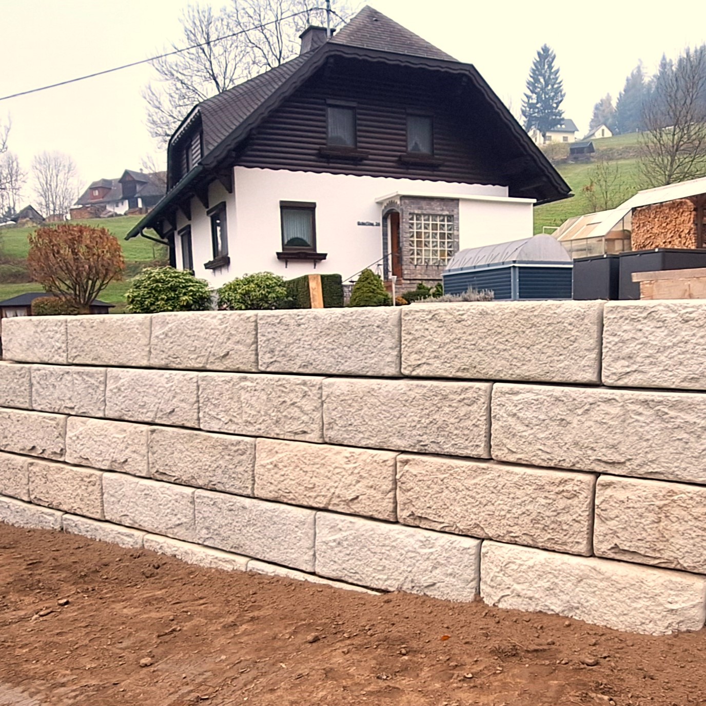 Durch den Einsatz der SW-Stützwandsteine im Radius (innen und außen) konnte die nutzbare Gartenfläche entlang eines geschwungenen und ansteigenden öffentlichen Weges erheblich vergrößert werden.