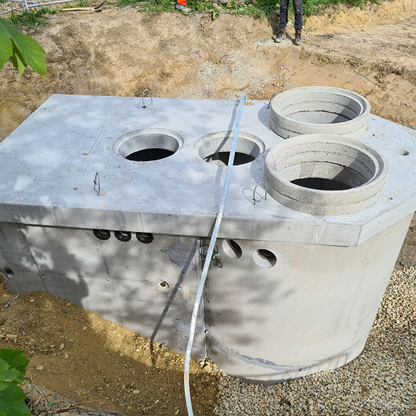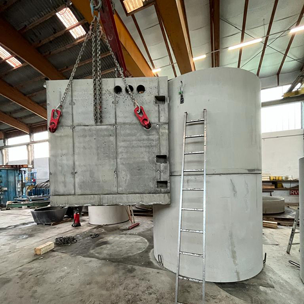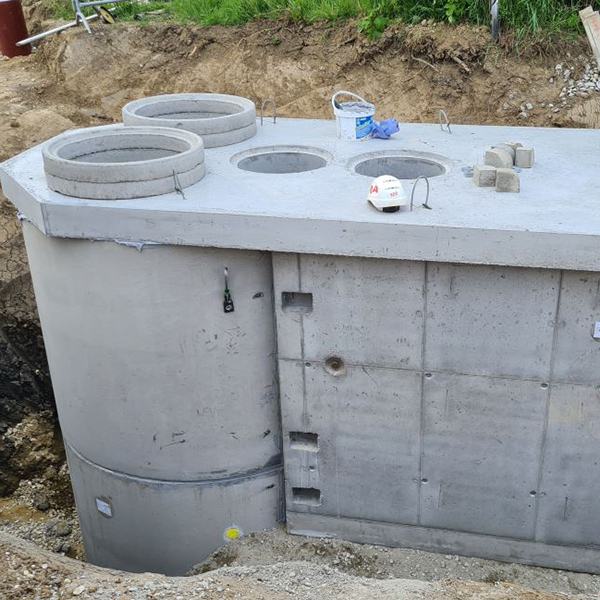In einem Siedlungsgebiet in Mistelbach an der Zaya wurde ein Fertigteilpumpwerk errichtet. Dafür wurde ein Pumpschacht DN 200 cm mit Wandstärke 15 cm mit einem rechteckigen Anbauschacht und Flachabdeckung versetzt.