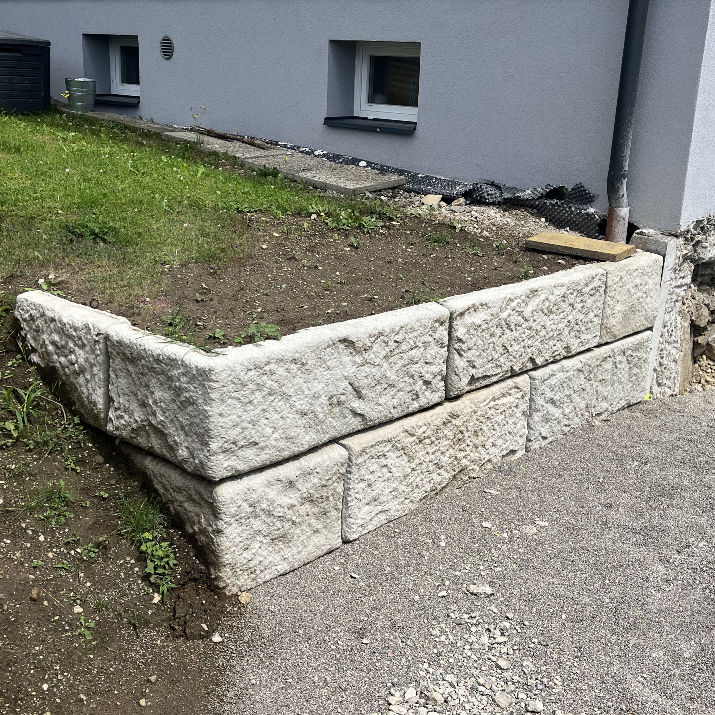 Bei diesem Privathaus in Weißenstein wurde mit dem SW-Stützwandsystem eine stabile Abgrenzung zum Nachbargrundstück sowie durch die gewonnene ebene Fläche Platz für einen Pool geschaffen. Durch die angestufte Ausführung konnte eine Terrassierung erreicht werden, die sich harmonisch in die Umgebung einfügt.