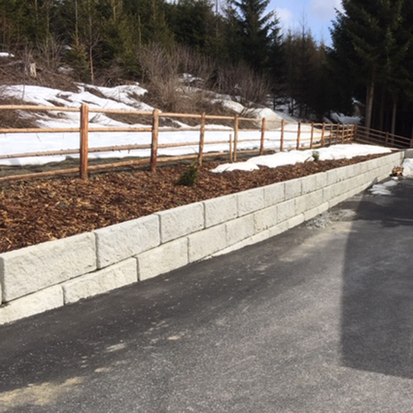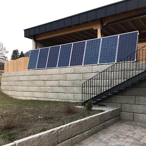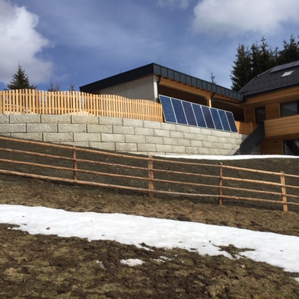 Das SW-Stützwandsystem wurde für die Außengestaltung der Chalet Anlage in Mauterndorf ausgewählt. Der Zaun und auch Sonnenkollektoren wurden direkt auf die Stützmauer montiert.