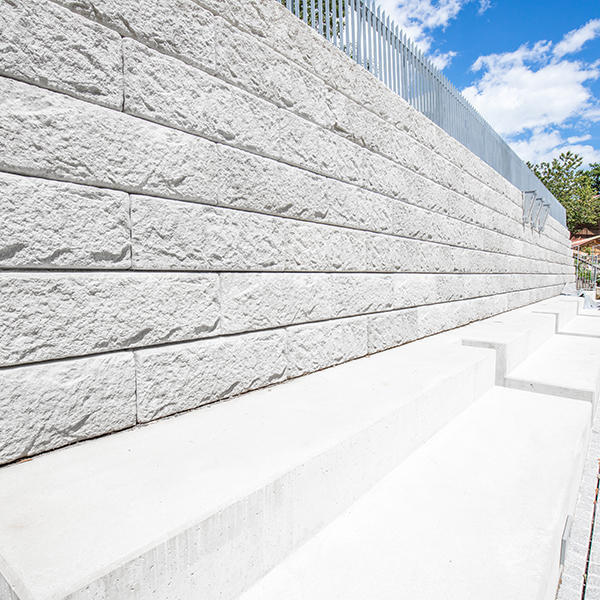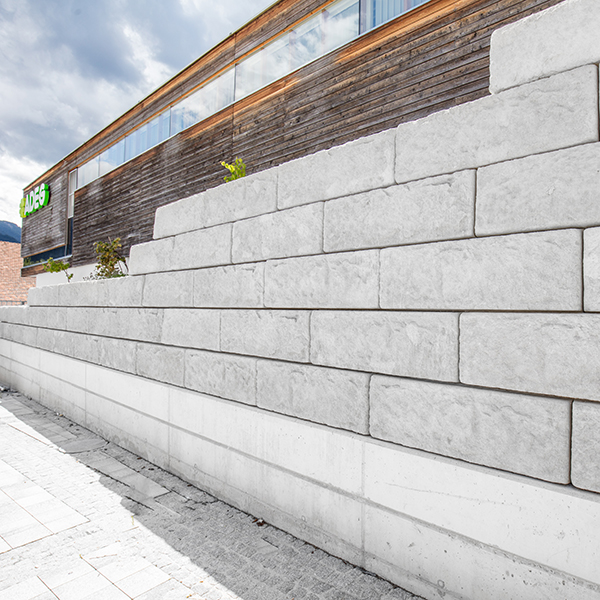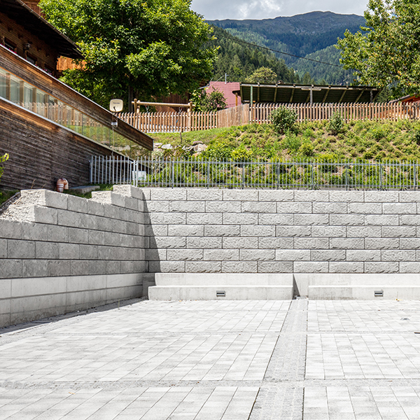 Für den neuen Gemeindehauptplatz in Berg im Drautal wurde eine massive Stützwand errichtet. Auf Grund des oberhalb des Platzes gelegenen Kindergartens, war eine Absturzsicherung unbedingt notwendig. Das System erlaubt eine direkte Montage der Absturzsicherung auf die Abschlussreihe – was in diesem Fall auch angewendet wurde. Vor der Stützwand wurden von Architekt und Planer Pucher aus Spittal Sitzmöglichkeiten aus Ortbeton platziert.