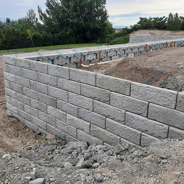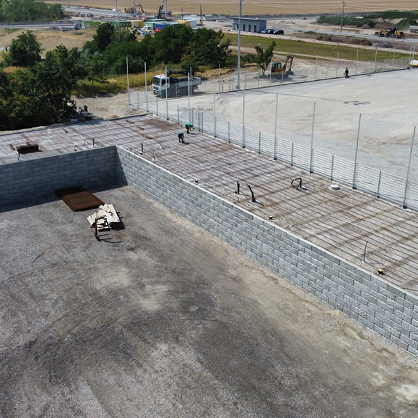 Für den Neubau eines Kunstrasenplatzes in Lassee wurde eine Stützwand errichtet. Um eine schnelle Umsetzung gewährleisten zu können, wurde das SW-Stützwandsystem gewählt. Die Mauer wurde auf ein Ortbetonfundament aufgesetzt und auf eine Höhe von 410 cm aufgebaut. In Summe wurden 595 Betonblöcke verbaut.