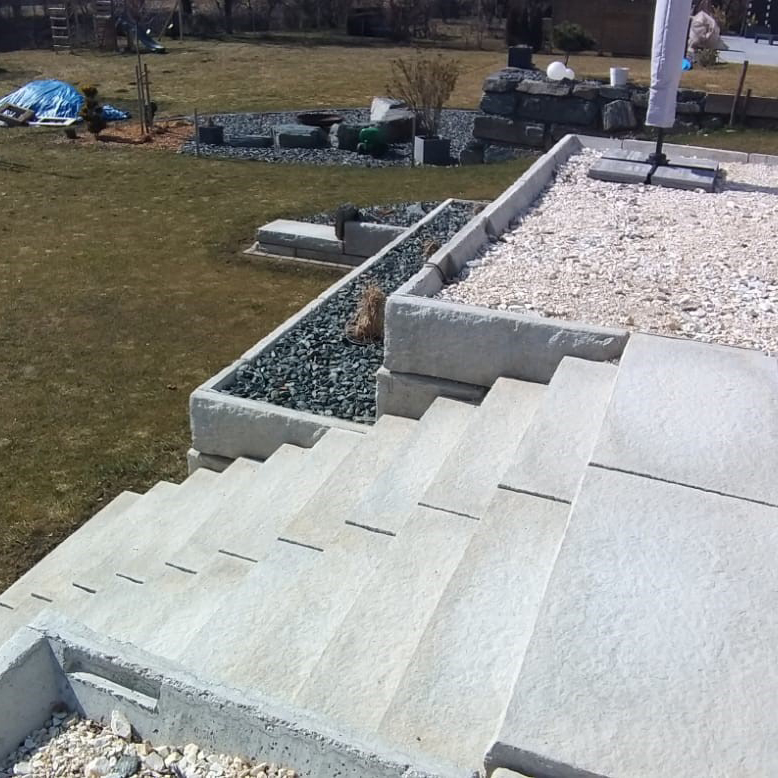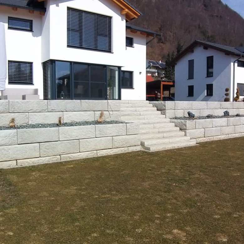 Bei diesem Projekt wurde eine attraktive Terrassensituation zum Ausgleich eines Niveauunterschiedes geschaffen. Die SW-Stützwandsystem Stufenplatten fügen sich hervorragend in die geschaffenen Terrassen ein.