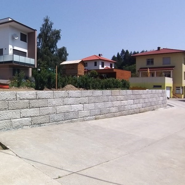 Durch die Schaffung einer gemeinsamen Hangsicherung für mehrere Einfamilienhäuser konnte mit dem SW-Stützwandsystem eine homogene Optik erreicht werden. Die Böschung konnte so in eine Gartenfläche umgestaltet werden.