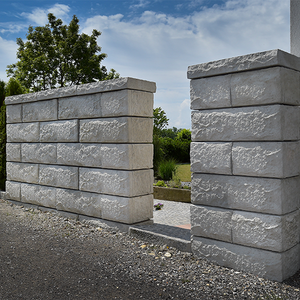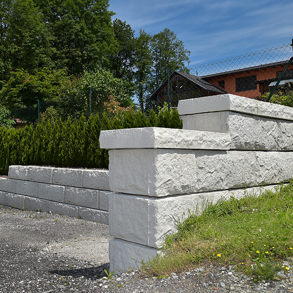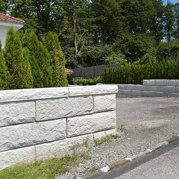 Mit dem SW-Stützwandsystem wurde die Umgestaltung der Hauseinfahrt realisiert. Mit Fence-Blöcken wurde sowohl eine Abgrenzung zur Straße als auch zum Garten geschaffen. Eine bestehende Betonwand zum Nachbarn wurde mit SW-Matrizen verkleidet und damit ein einheitliches Erscheinungsbild geschaffen.
