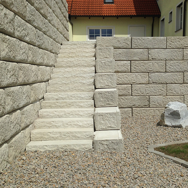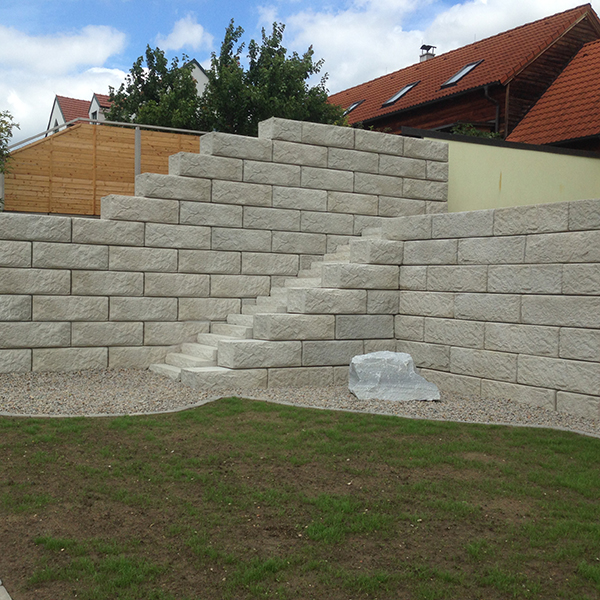Mit dem SW-Stützwandsystem wurde ein Sichtschutz, eine Abgrenzung zum Nachbargrundstück sowie eine Terrassenerweiterung realisiert und zusätzlich ein Aufgang mit SW-Stufenplatten errichtet.