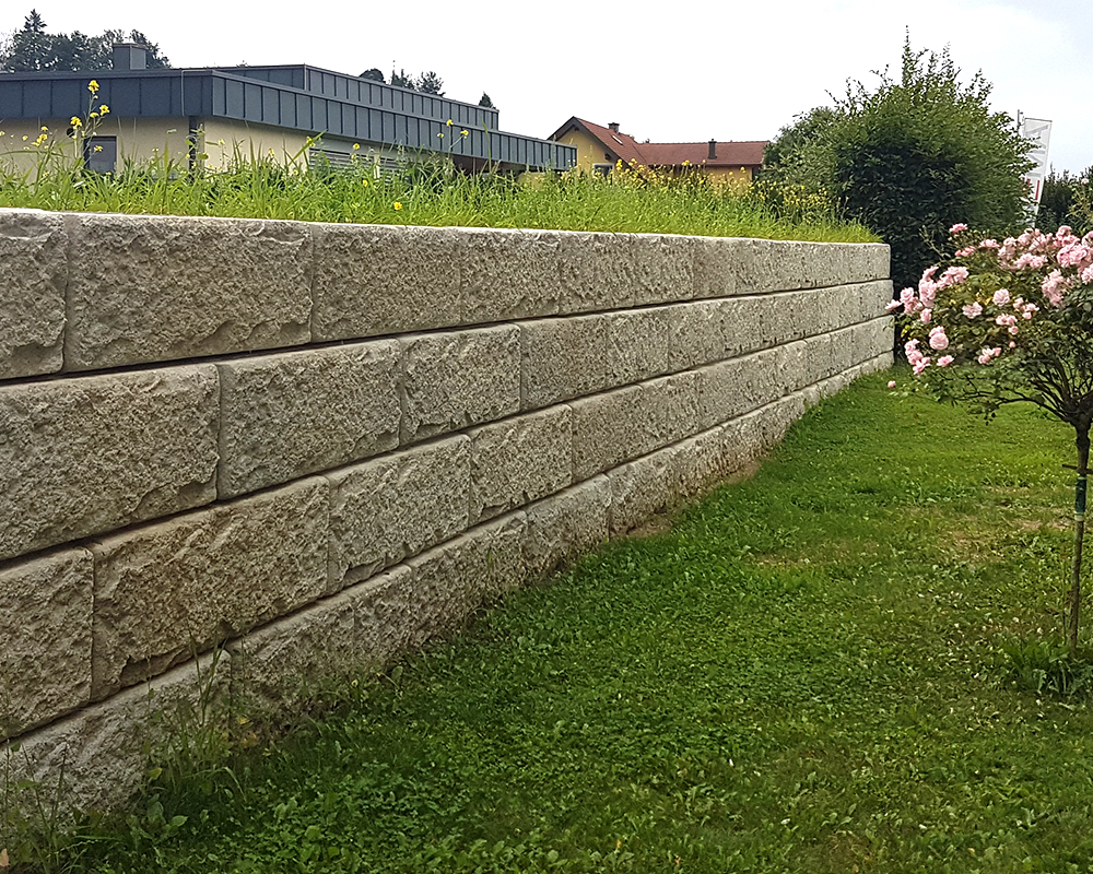 Um den Höhenausgleich zwischen zwei unterschiedlich hohen Grundstücken auszugleichen, wurde hier das SW-Stützwandsystem verbaut.